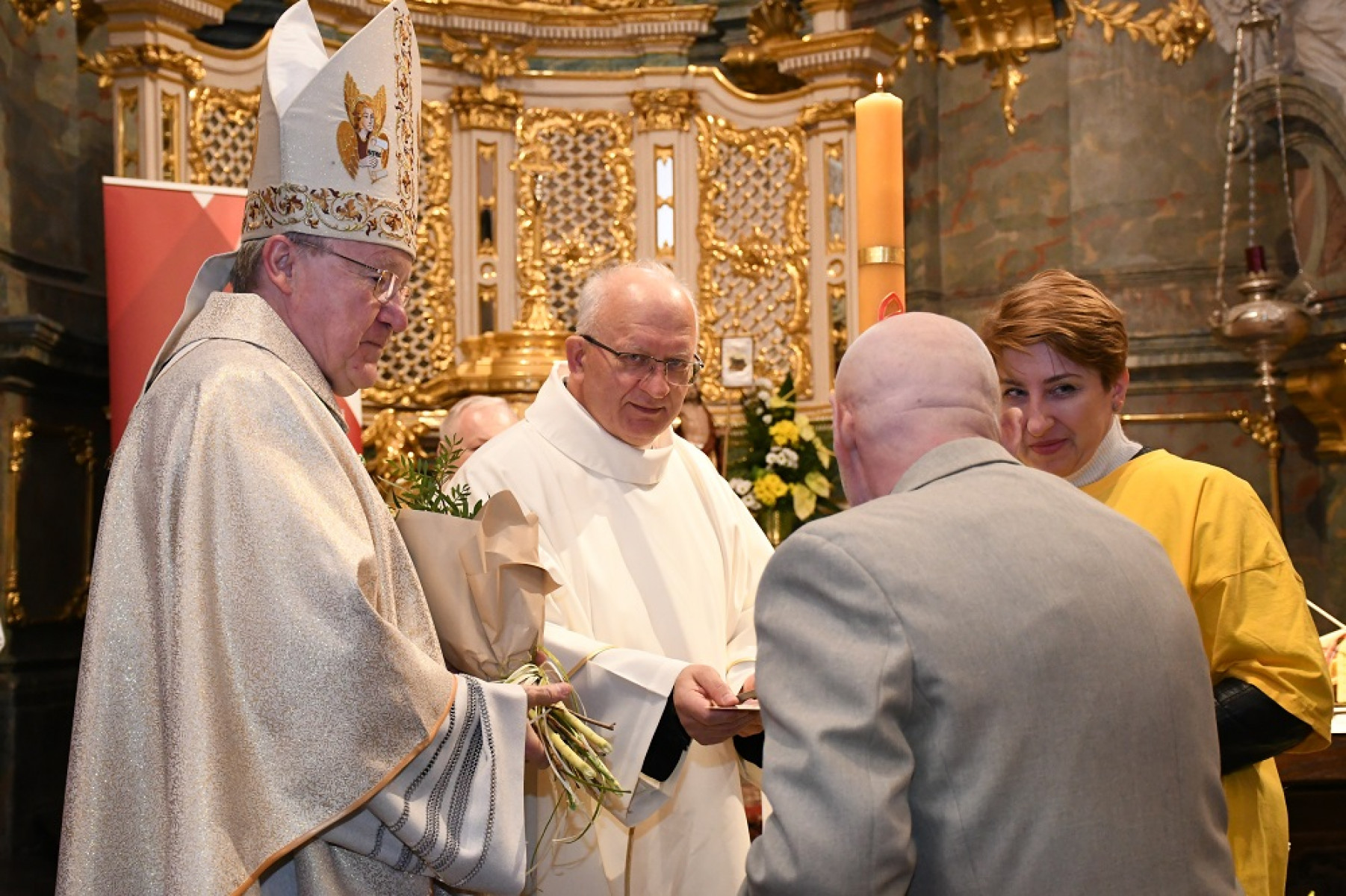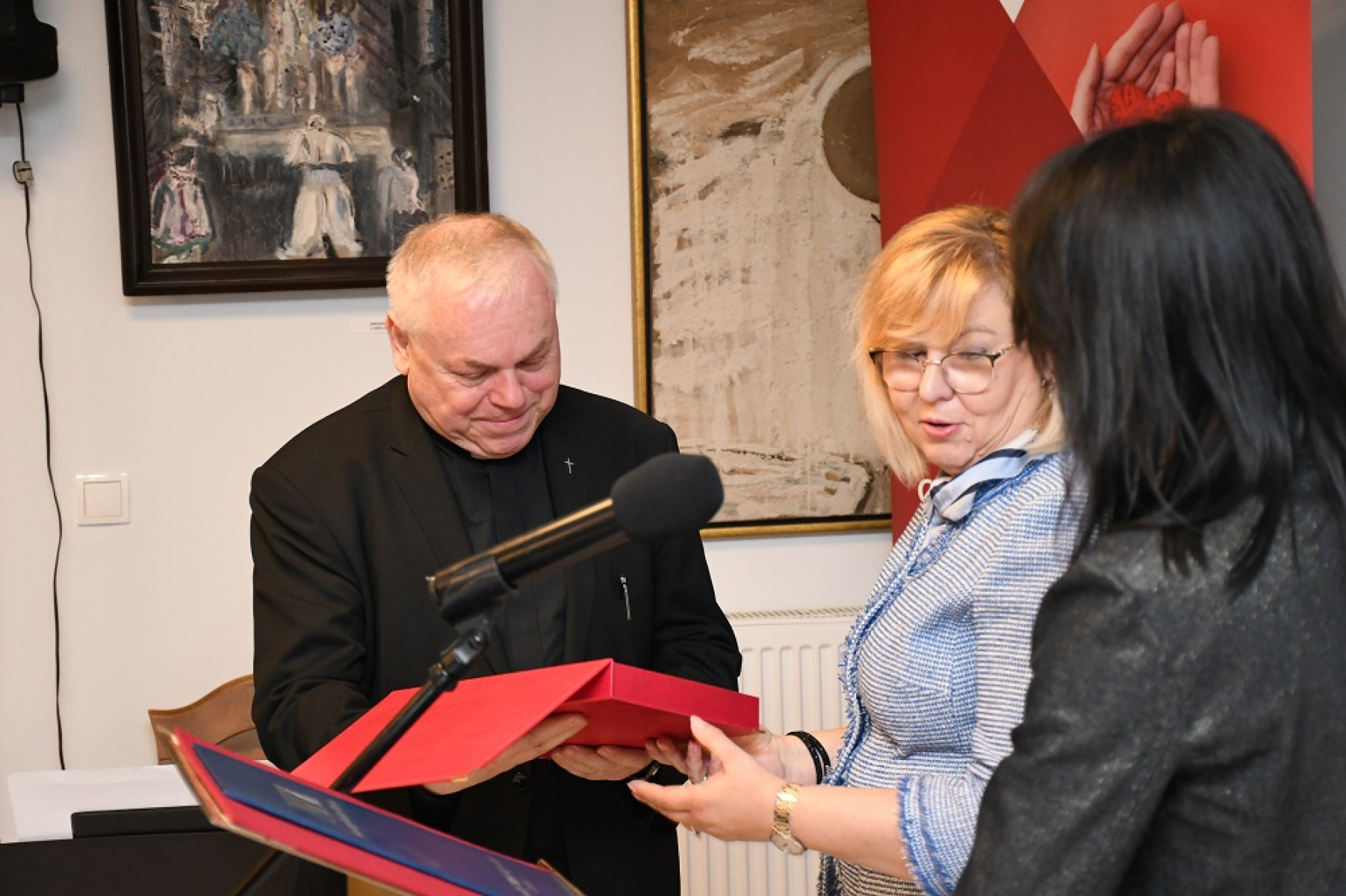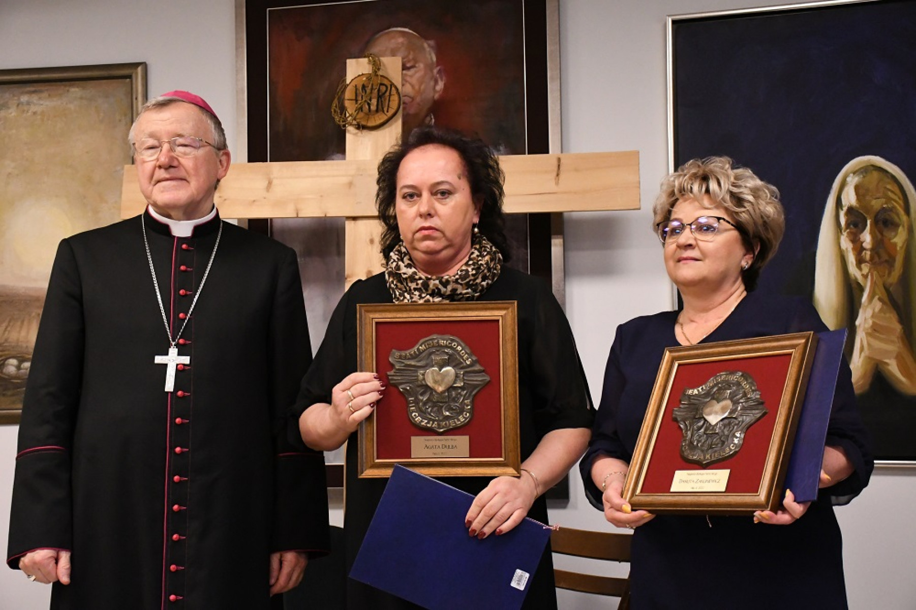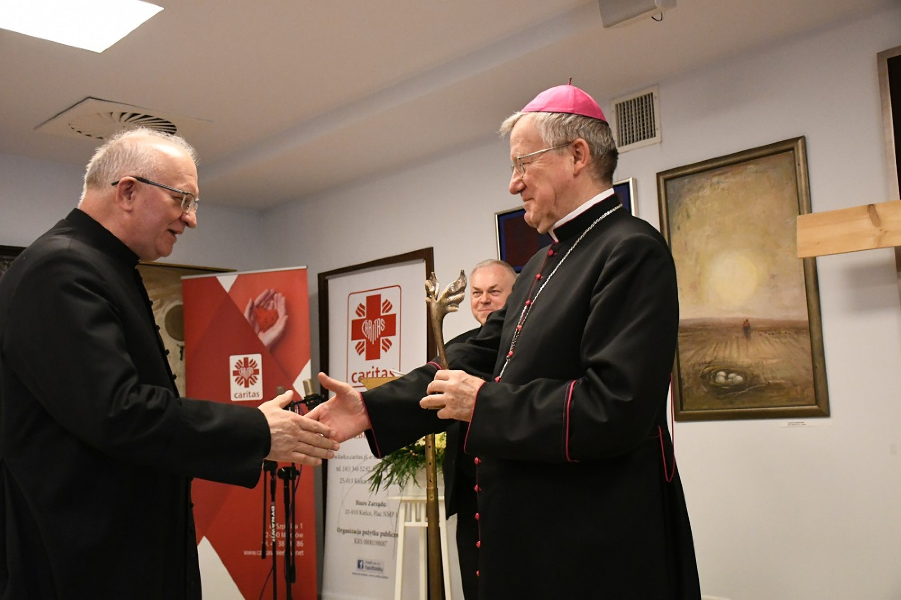 Biskup Andrzej Kaleta honoruje zasłużonych pracowników placówek Caritas w Miechowie