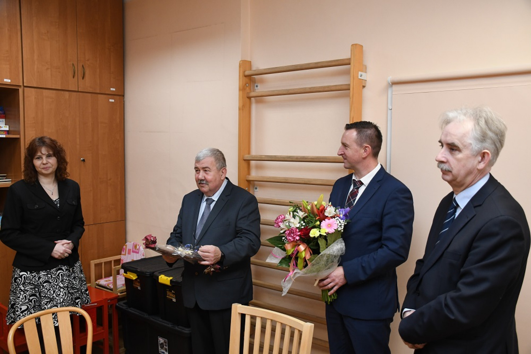 Starosta Miechowski Jacek Kobyłka kwiatami podziękował za 50-lecie Poradni Psychologiczno - Pedagogicznej w Miechowie