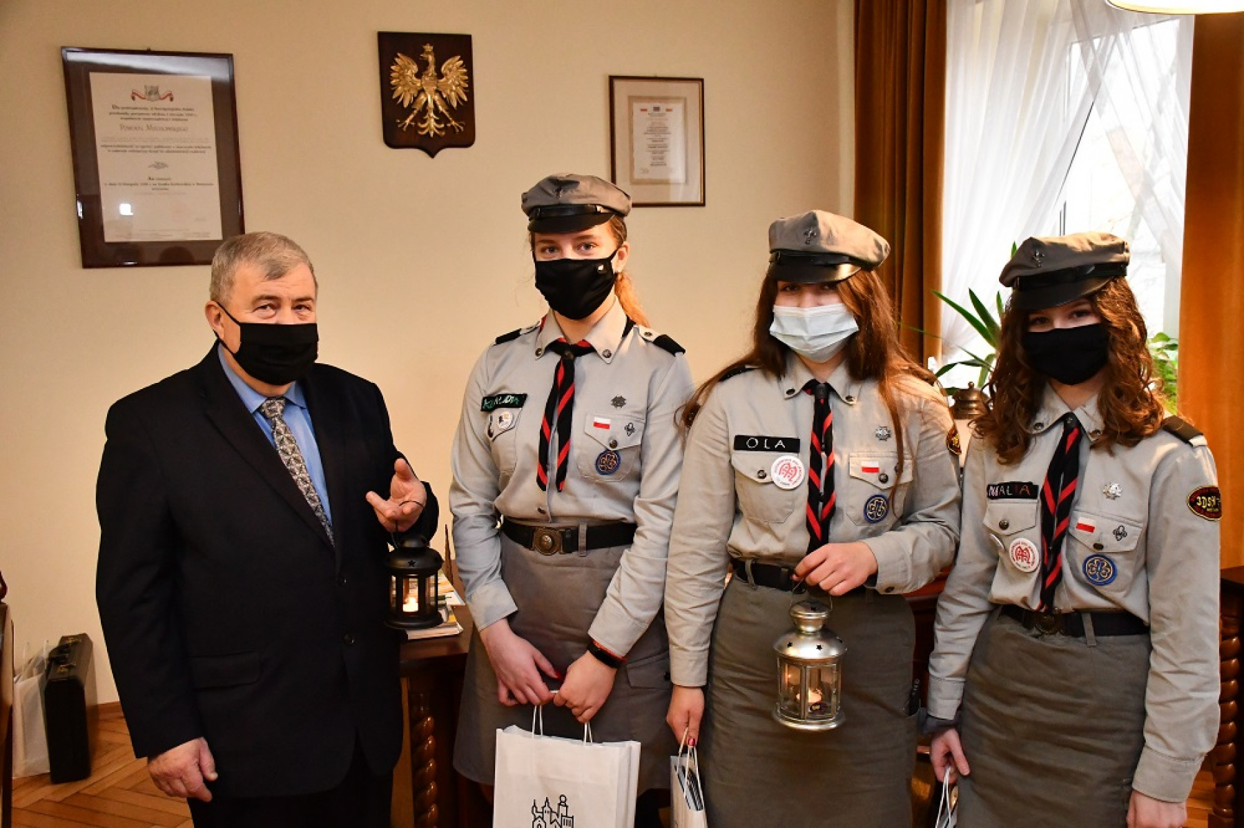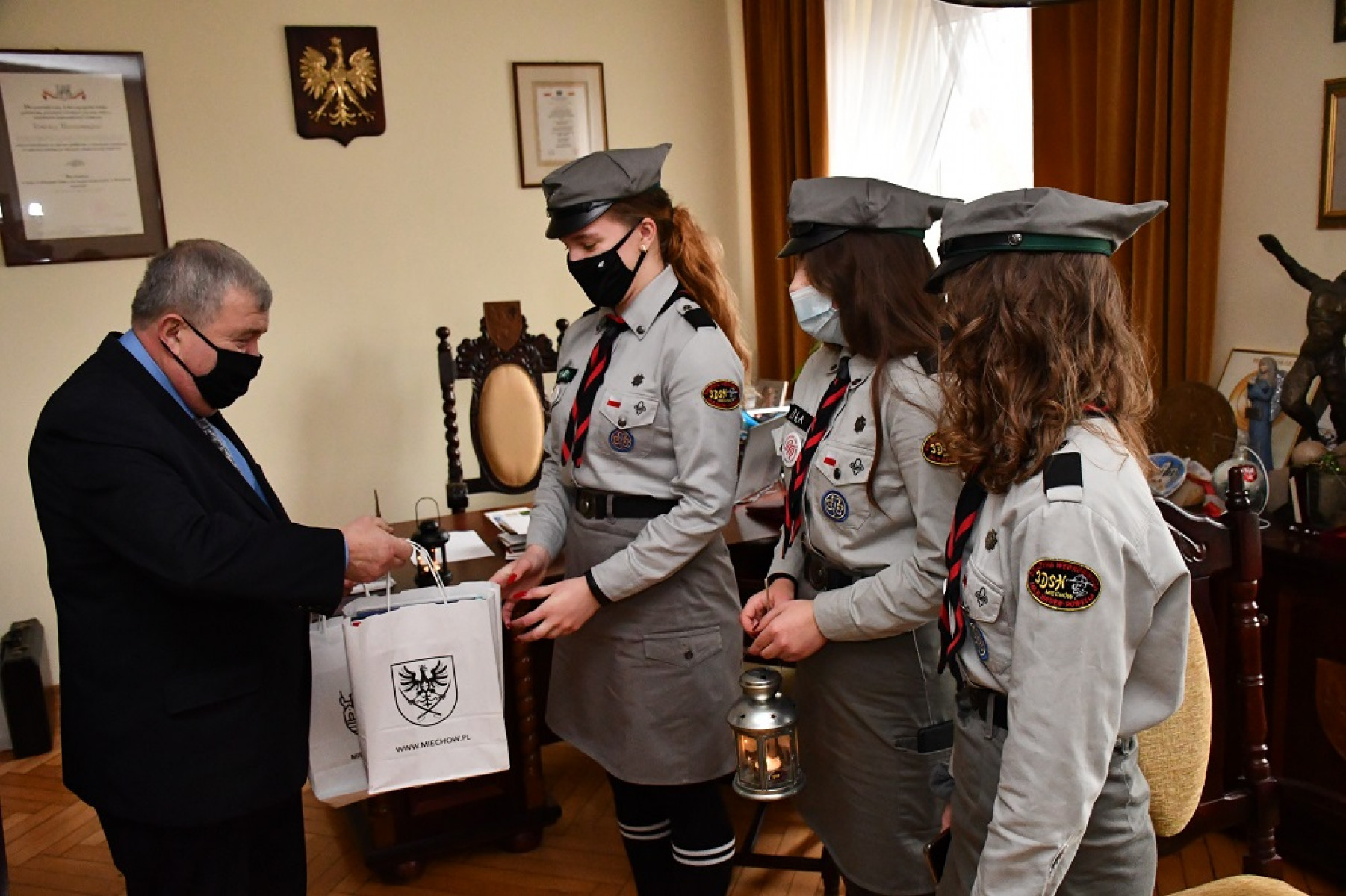 Starosta Powiatu Miechowskiego życzył młodzieży, by jak najszybciej mogli się spotykać w ławach szkolnych, w gronie swych przyjaciół, by odbudować uśpione przez zdalną naukę relacje rówieśnicze. Wręczając skromne upominki harcerkom - Natalii Kołodziej, Aleksandrze Gądek i Klaudii Przeździk, starosta Jacek Kobyłka przyznał, że robi mu się na duszy weselej, gdy spoglądając przez okno widzi młodych ludzi. Zatem był wyrazicielem nie tylko swojego życzenia, by w końcu wirus został pokonany, aby zapanowała zwykła codzienność, ta sprzed pandemii.
