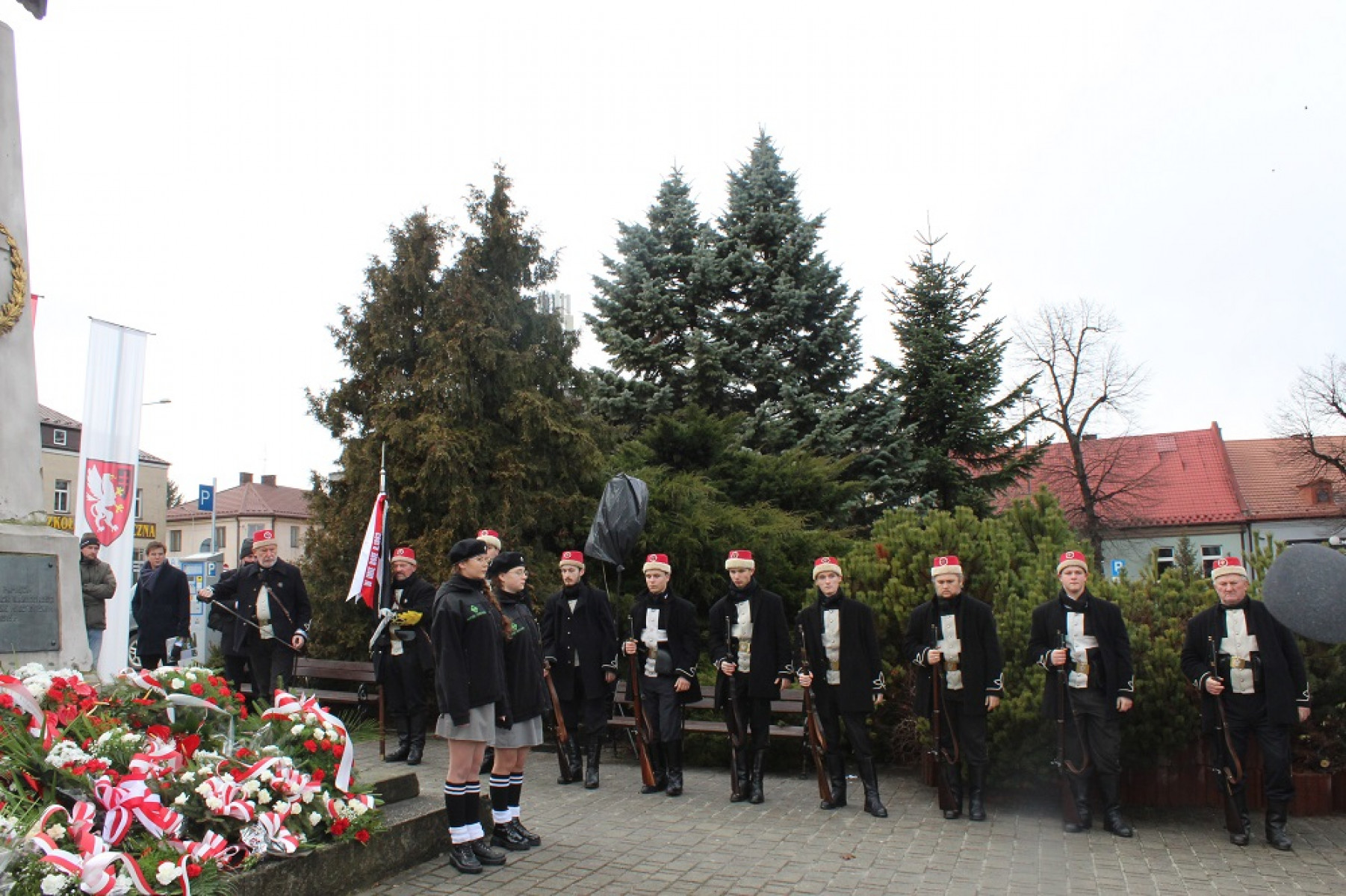 Tutaj apel poległych odczytał Robert Osiński, dowódca Grupy Rekonstrukcji Historycznej ,,Żuawów Śmierci” z Buska Zdroju, która już po raz 12 towarzyszyła miechowskim obchodom. Po oddaniu salwy honorowej, przy pomniku z Orłem kwiaty złożyli samorządowcy, przedstawiciele zakładów pracy, szkół i kombatantów.
