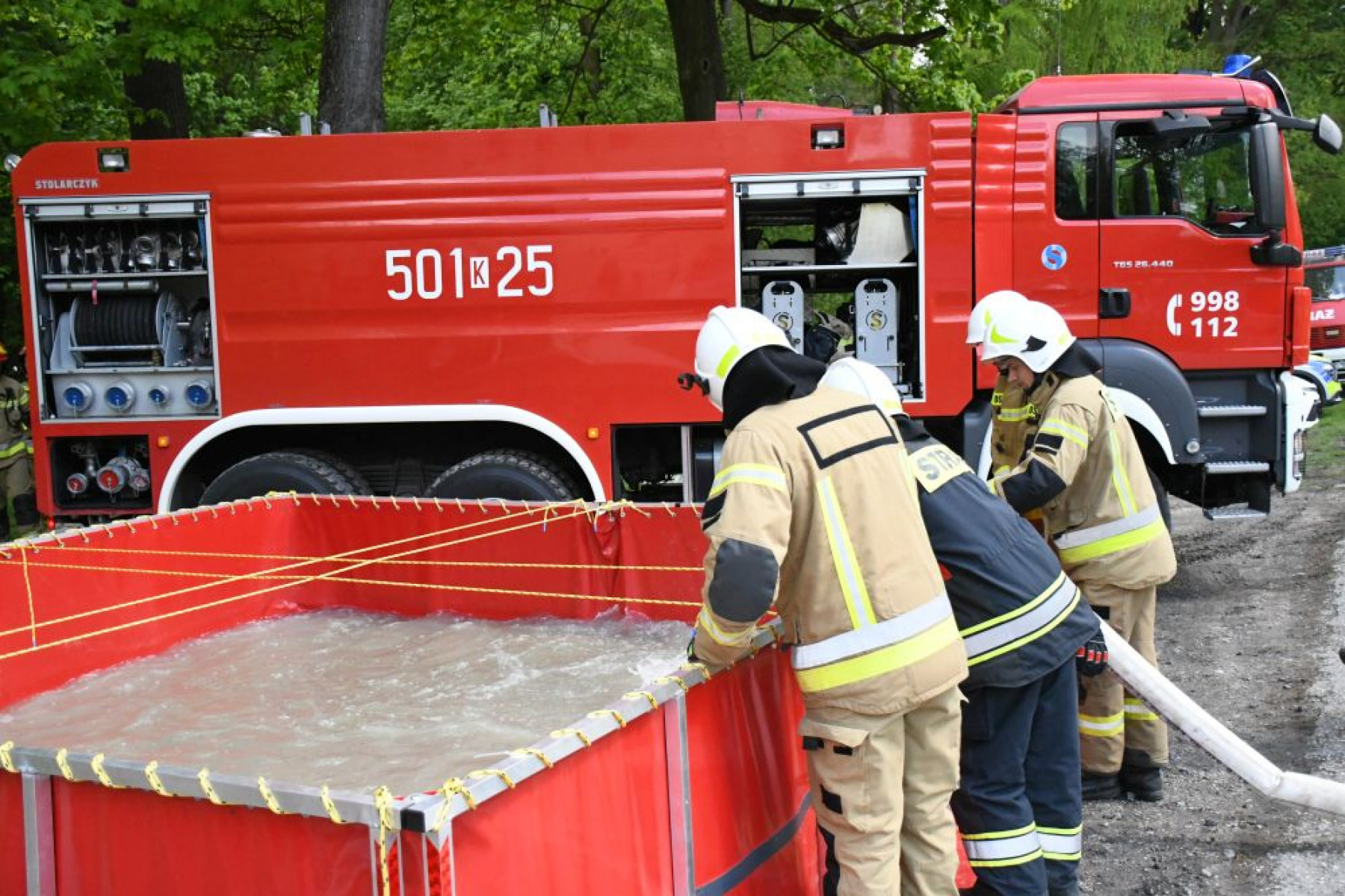 Strażacy uwijają się przy rozkładaniu zbiornika podczas ćwiczeń w Książu Wielkim