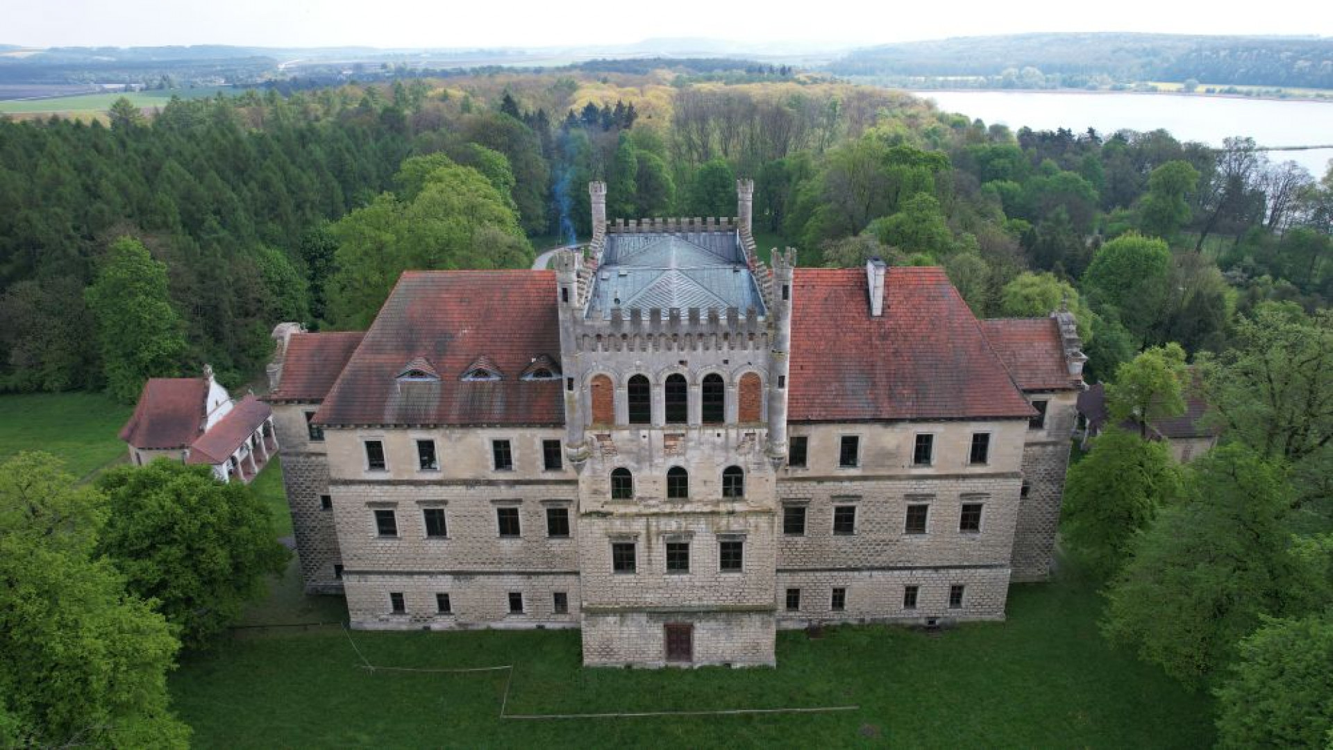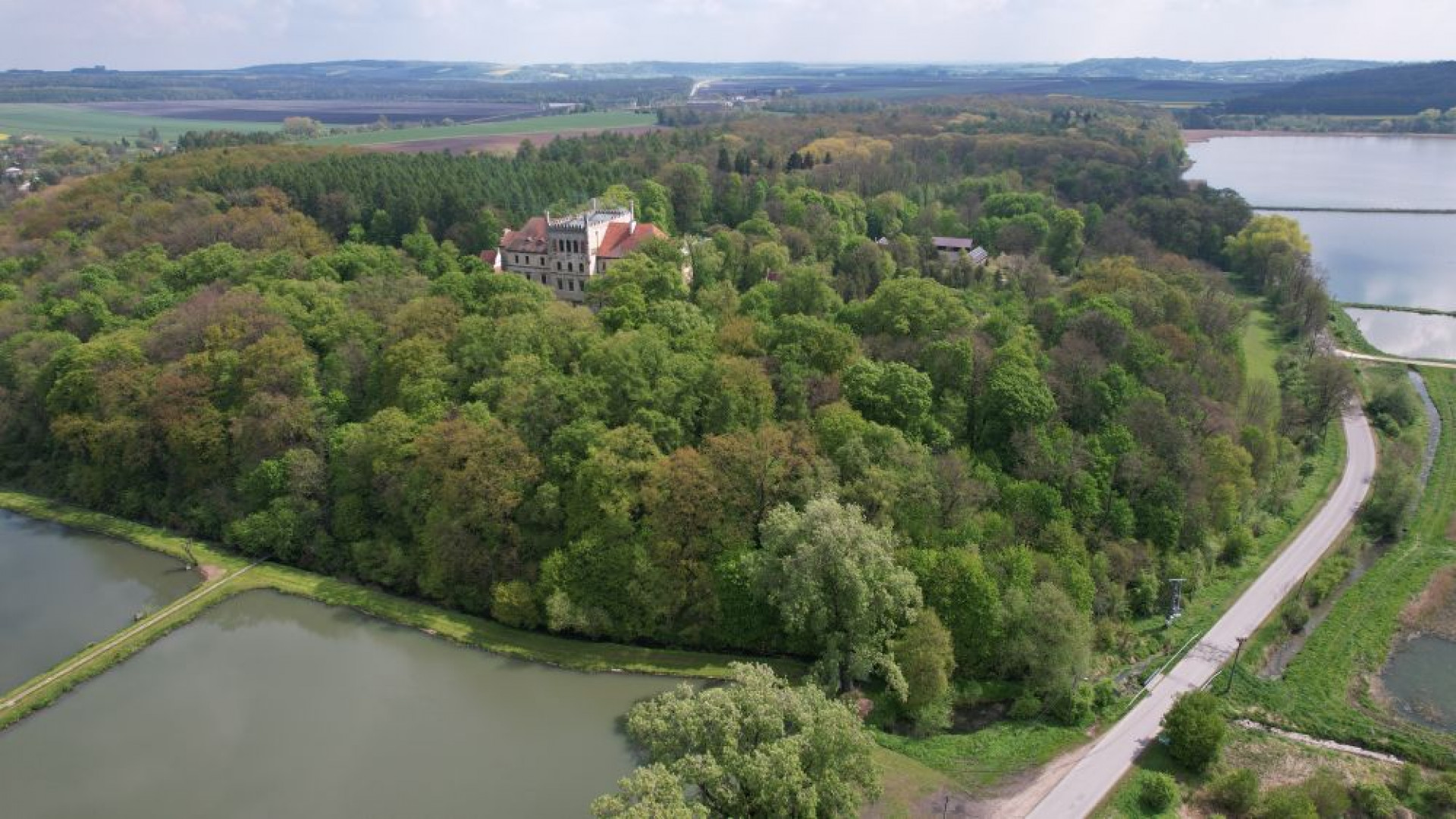 Pałac na Mirowie w Książu Wielkim otoczony stawami