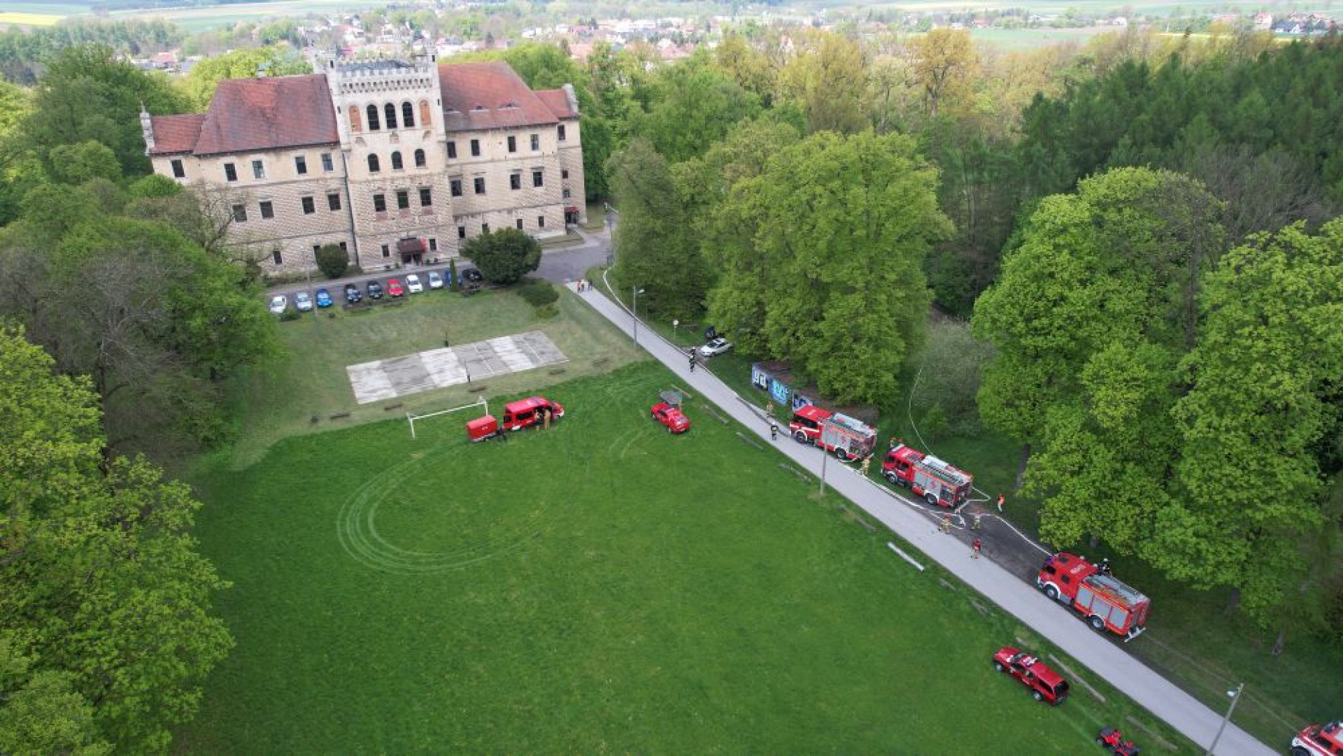 Ćwiczenia ratowniczo-gaśnicze w Książu Wielkim - widok z lotu ptaka