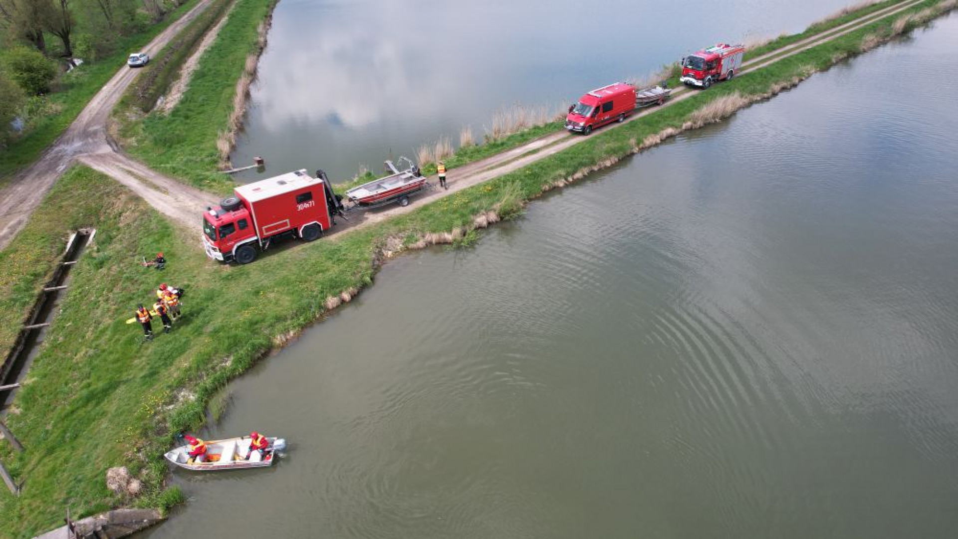 Po dojeździe kolejnych jednostek i w trakcie prowadzonych działań okazało się, że na terenie pobliskich stawów osoba pod wpływem zdarzenia (pożaru lasu) nie zachowała ostrożności i wypadła z łodzi, znajduje się pod powierzchnią wody i nie ma z nią kontaktu. Druga osoba znajduje się w łodzi i czeka na pomoc (epizod 2 - działania wodno - nurkowe).