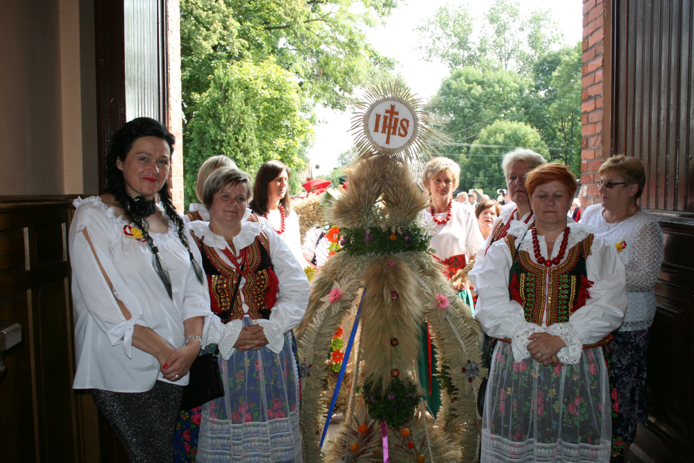 Następnie barwny korowód dożynkowy z kapelą ludową, grupą rowerzystek, bryczką wioząca starostów dożynkowych i współorganizatorów: starostę i wójta gminy Kozłów, z pojazdami z wieńcami dożynkowymi i gospodyniami oraz goście i mieszkańcy - przemieścił się na miejsce imprezy. Dożynki prowadził konferansjer Grzegorz Bełz. Uczestników Powiatowego Święta Plonów powitał wójt Jan Zbigniew Basa. Wśród gości obecni byli: wicepremier Jarosław Gowin, poseł Agnieszka Ścigaj, senator Marek Pęk, wojewoda Piotr Ćwik, wicemarszałek województwa Wojciech Kozak, radny wojewódzki Adam Domagała, reprezentacje gminne Kół Gospodyń Wiejskich, dyrektorzy firm okołorolniczych z Małopolski, członkowie Zarządu Powiatu Miechowskiego, radni powiatu i gmin ze swymi przewodniczącymi, burmistrz i wójtowie, przedstawiciele służb mundurowych.