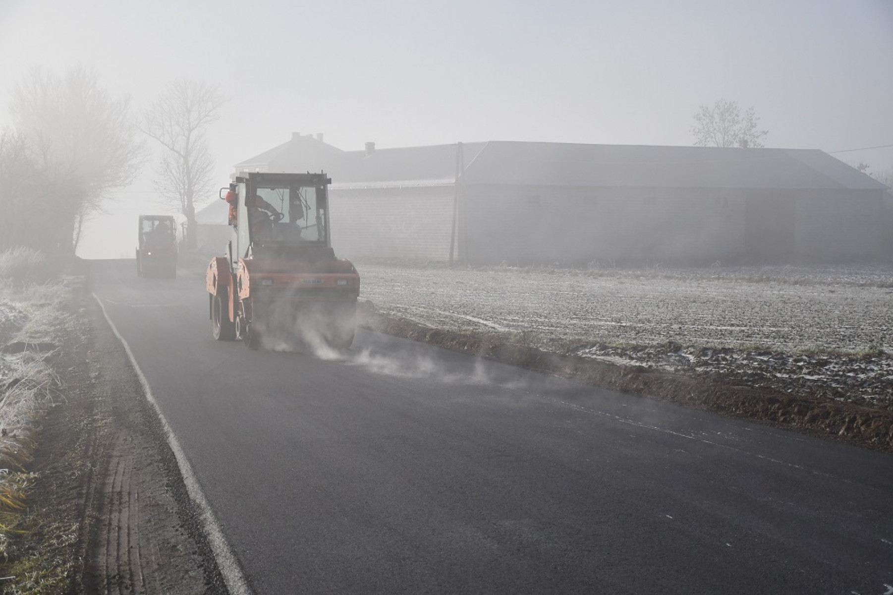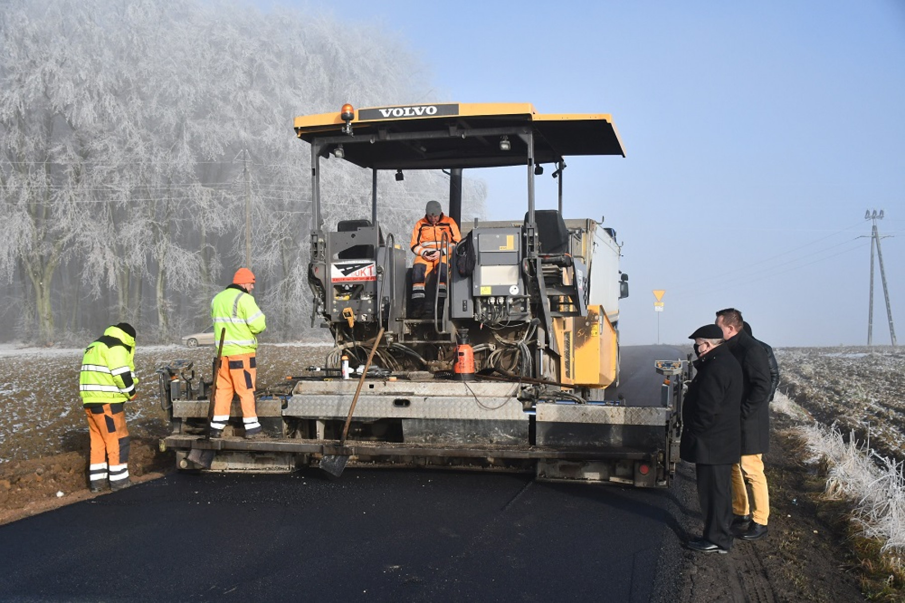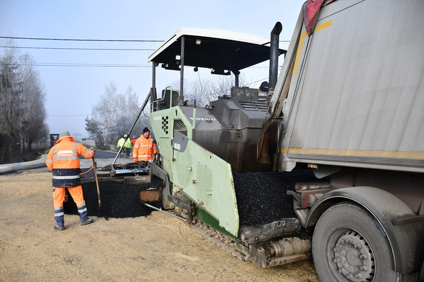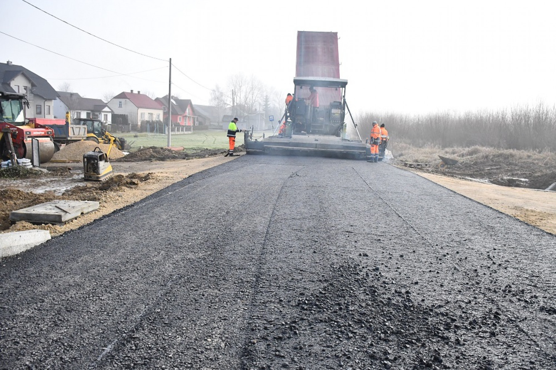 Układanie asfaltu na drodze powiatowej w Brzuchani