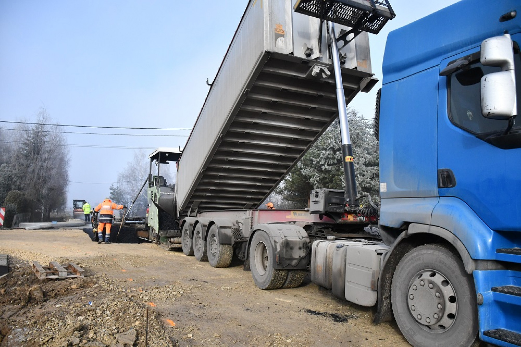 Wyładunek asfaltu na moście w Swojczanach
