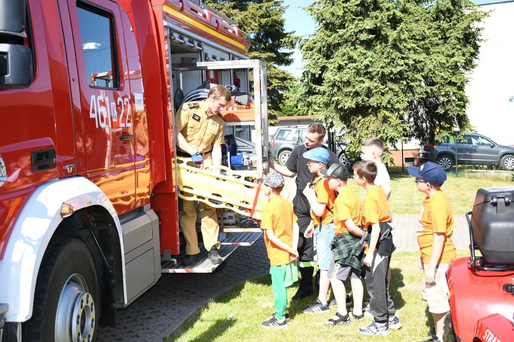 Dzień Dziecka służb mundurowych 2023 - chłopcy podziwiają strażackiego quada