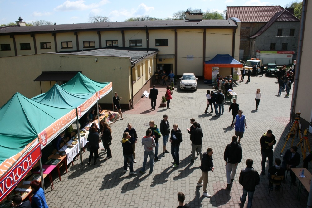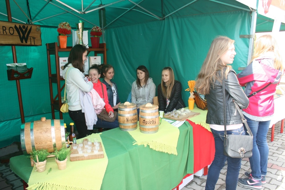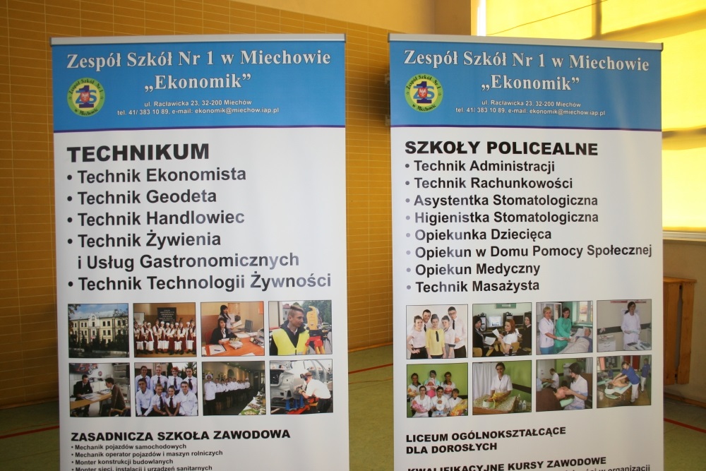 Na dziedzińcu szkolnym swoje stoiska prezentowali okoliczni pracodawcy i firmy z różnych branży. Uczniowie ,,ekonomika” zachęcali gimnazjalistów do odwiedzania stoisk i klas, gdzie na przykładach zaaranżowanych kierunków nauczania i specjalności zawodowych mogli zapoznać się z ofertą nauczania w szkole.