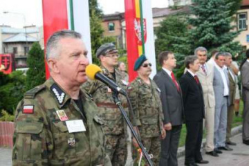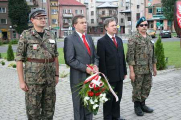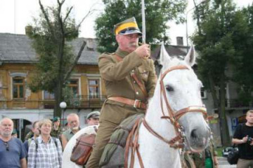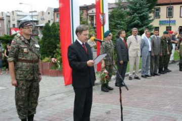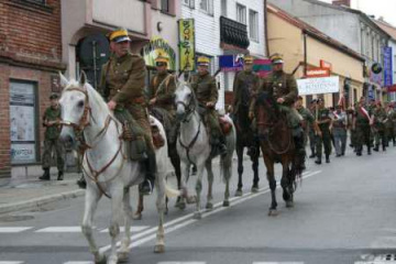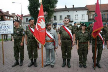 W imieniu samorządów powiatowego i gminno-miejskiego ,,kadrówkę" powitał starosta Mieczysław Bertek. - /Od lat witamy Was w centrum Miechowa i jesteśmy pełni podziwu dla fenomenu Marszu Szlakiem I Kompanii Kadrowej. Dzisiaj także stawiamy sobie pytanie: co Państwa - uczestników Marszu znowu połączyło i przywiodło do naszego miasta, które było na szlaku historycznego przemarszu strzelców Piłsudskiego? Odpowiedź jest jedna: to misja krzewienia wartości niepodległościowych i patriotycznych. To okazja do pielęgnowania szczególnych i rzadkich cech: miłości do Ojczyzny, poczucia godności i dumy narodowej oraz honoru. /Uczestnikami powitania była także goszcząca w Miechowie delegacja samorządu XII Związku Krain Górskich ,,Monti Ernici" z regionu Lazio we Włoszech, z którymi od lat współpracuje powiat miechowski. Prowadzący po raz 12 historyczny marsz komendant Jan Józef Kasprzyk podzielił się refleksją o znaczeniu niepodległości dla Polaków. Przypomniał, że ,,wolność nie jest dana raz na zawsze. Trzeba ją umiejętnie pielęgnować i bronić w każdej sytuacji - zarówno w czasach wojny i pokoju". Komendant przypomniał, że tegoroczny jubileuszowy marsz na historycznej trasie Kraków (Oleandry) - Kielce odbywa się w 100. rocznicę ruchu strzeleckiego, 96. rocznicę Czynu Legionowego oraz w 90. rocznicę Bitwy Warszawskiej.