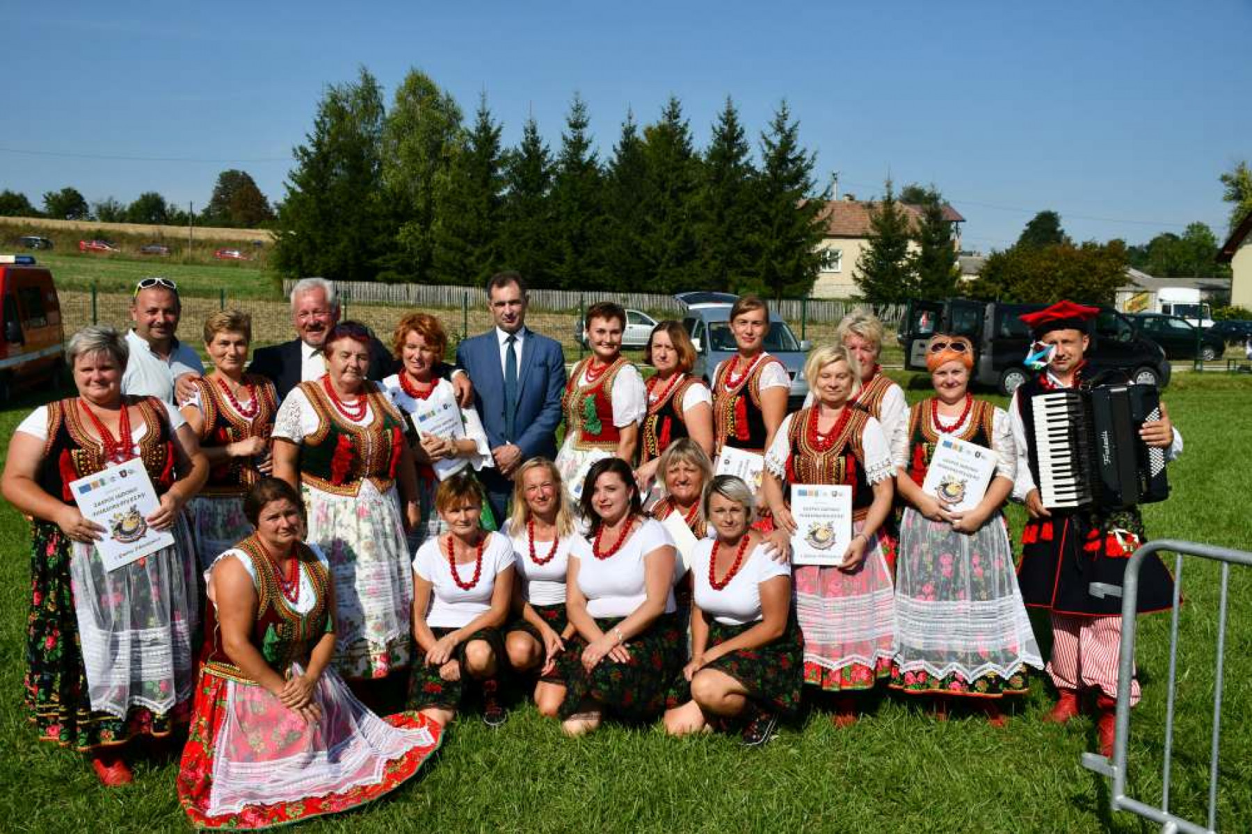 Po wystąpieniach gości przyszedł czas na tradycyjne ośpiewanie wieńców, gospodarzy, włodarzy samorządów przez reprezentacje poszczególnych gmin powiatu miechowskiego. Po części obrzędowej przyszedł czas na rozstrzygnięcie konkursów. Jury, któremu przewodniczył Marcin Florek z Muzeum Ziemi Miechowskiej, przyznało Nagrodę Starosty (czek na 2000 zł) za najpiękniejszy wieniec dożynkowy przedstawicielom gminy Książ Wielki - KGW Zaryszyn. Doceniając trudy wszystkich twórców wieńców, reprezentacje pozostałych gmin otrzymały po 300 zł.
