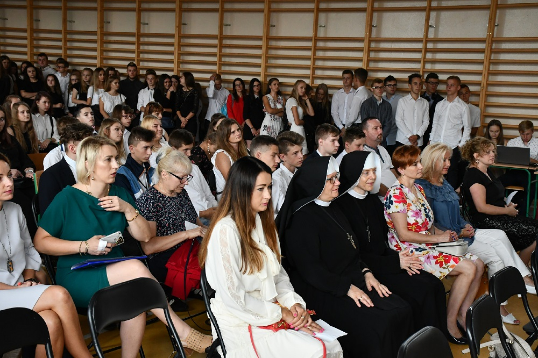 Grono pedagogiczne i młodzież na rozpoczęciu roku szkolnego 2019/2020 w ZS Nr 1 w Miechowie