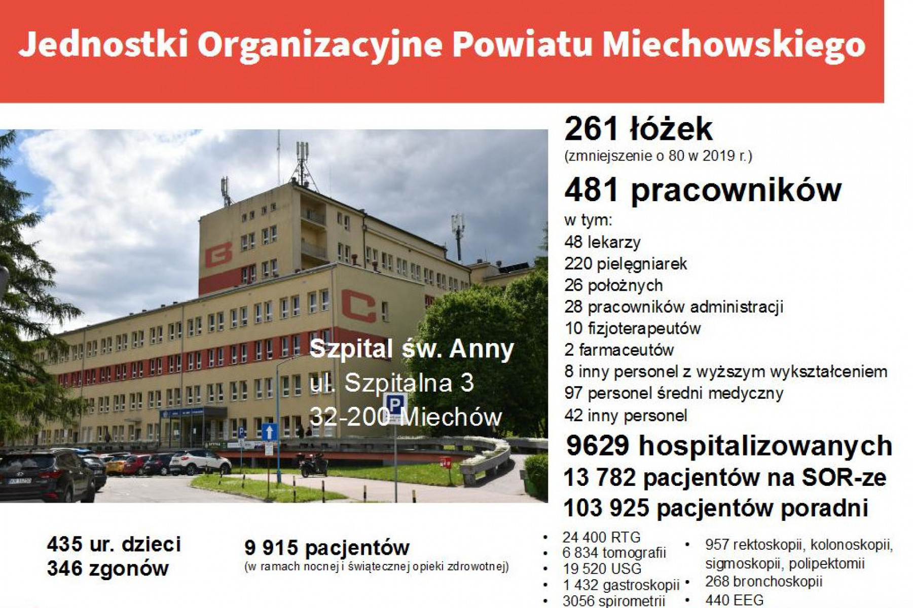 To, jak ważna jest opieka zdrowotna dla mieszkańców i Szpital św. Anny w Miechowie, świadczy fakt, że w 2019 r. było: 9629 hospitalizowanych, 13 782 pacjentów na SOR-ze i aż 103 925 pacjentów poradni specjalistycznych.By poprawić warunki szpitalne, w ramach Regionalnego Programu Operacyjnego realizowany jest projekt Poprawa dostępności i jakości usług zdrowotnych świadczonych przez Szpital w Miechowie poprzez zakup sprzętu i modernizację infrastruktury (7,7 mln zł dotacji z UE).