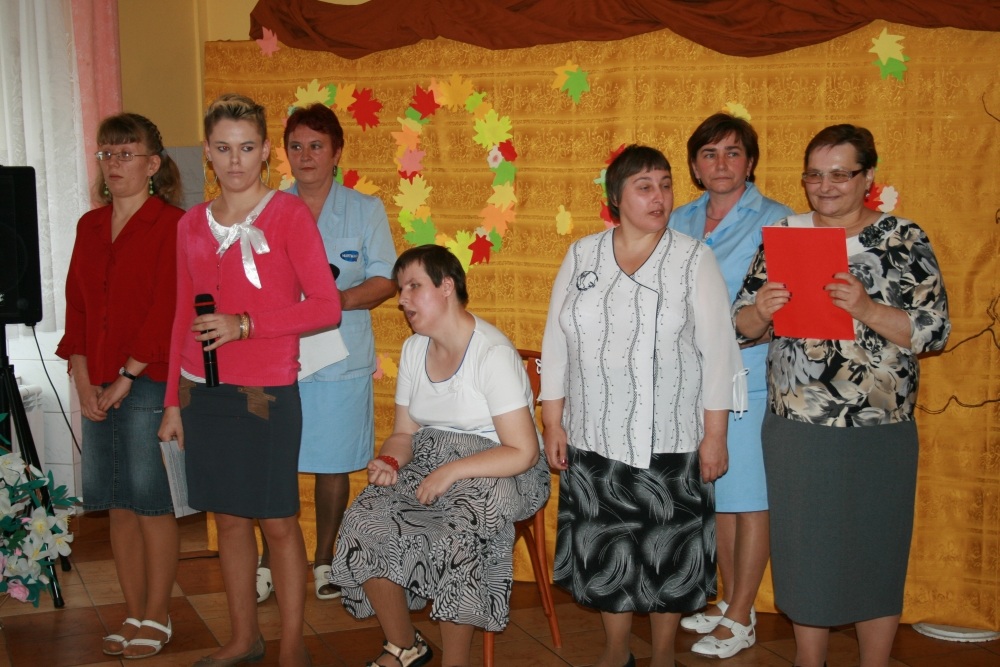 13 Listopada 2012(...) Uroczystość rozpoczęła Msza św. w dworskiej kaplicy z udziałem gości, pracowników i pensjonariuszy. – Ducha życzliwości, miłości i troskliwości do drugiego człowieka muszą mieć ci, który tutaj pracują – stwierdził w homilii przewodzący liturgii ks. kanonik Edward Nowak. Część oficjalną otworzył dyrektor domu Stanisław Krochmal, który piastuje stanowisko od kwietnia 1992r. Przypomniał on najważniejsze fakty z 6. dekad funkcjonowania mianocickiej placówki, w tym daty, fakty, zdarzenia, uroczyste chwile i przełomowe wydarzenia, a przede wszystkim nazwiska osób tworzących jego historię, w tym dyrektorów zakładu. Starosta Marian Gamrat dziękował kierującym domem i jego kolejnym personelom za tworzenie niezbędnych warunków dla zapewnienia pensjonariuszom – ludziom chorym, starym, bezdomnym i upośledzonym w różnym stopniu, godnego życia. Z odrębnymi słowami zwrócił się do mieszkańców: ,,Życzę, by nadal w tym miejscu znajdowali Państwo spokój i ukojenie oraz wszechstronną pomoc. To Państwo, mieszkańcy tego Domu jesteście jego dusza i ciałem. To Państwa obecność nadaje sens pracy personelowi tego domu i jest dowodem, jak bliska może być więź pomiędzy potrzebującymi wsparcia, a dobrodziejami, którzy jego udzielają”. Z okolicznościowymi życzeniami pospieszyli przewodniczący Rady Powiatu Marian Brodowicz (także z tortem), wójt gminy Książ Wielki Marek Szopa i kierownik PCPR Helena Kruszec. Wśród obecnych na sali znaleźli się dyrektor Jan Bębacz, który kierował domem od lipca 1977 do sierpnia 1982r. i najdłużej zamieszkująca pensjonariuszka Maria Żwirek (od 1957r.). Liczną grupę stanowili szefowie i pracownicy innych placówek opiekuńczych z powiatu miechowskiego. Obecni na sali wysłuchali przygotowanego wespół z opiekunami na okazję jubileuszu występu zespołu ,,Książacy”, skaładającego się z mieszkańców, którzy śpiewem i tekstem rozbawiali widownię. Następnie goście oglądali wystawę poświęconą dziejom DPS w Mianocicach, na którą składały się fotografie i dokumenty oraz prace wykonane przez mieszkańców. Dopełnieniem obchodów 6. dekad działalności zasłużonej placówki opiekuńczej była monograficzna broszura poświęcona temu wydarzeniu zawierająca cenne informacje i fotografie o historii obiektu i rodzinie Hallerów, otoczeniu domu i jego pracownikach.
