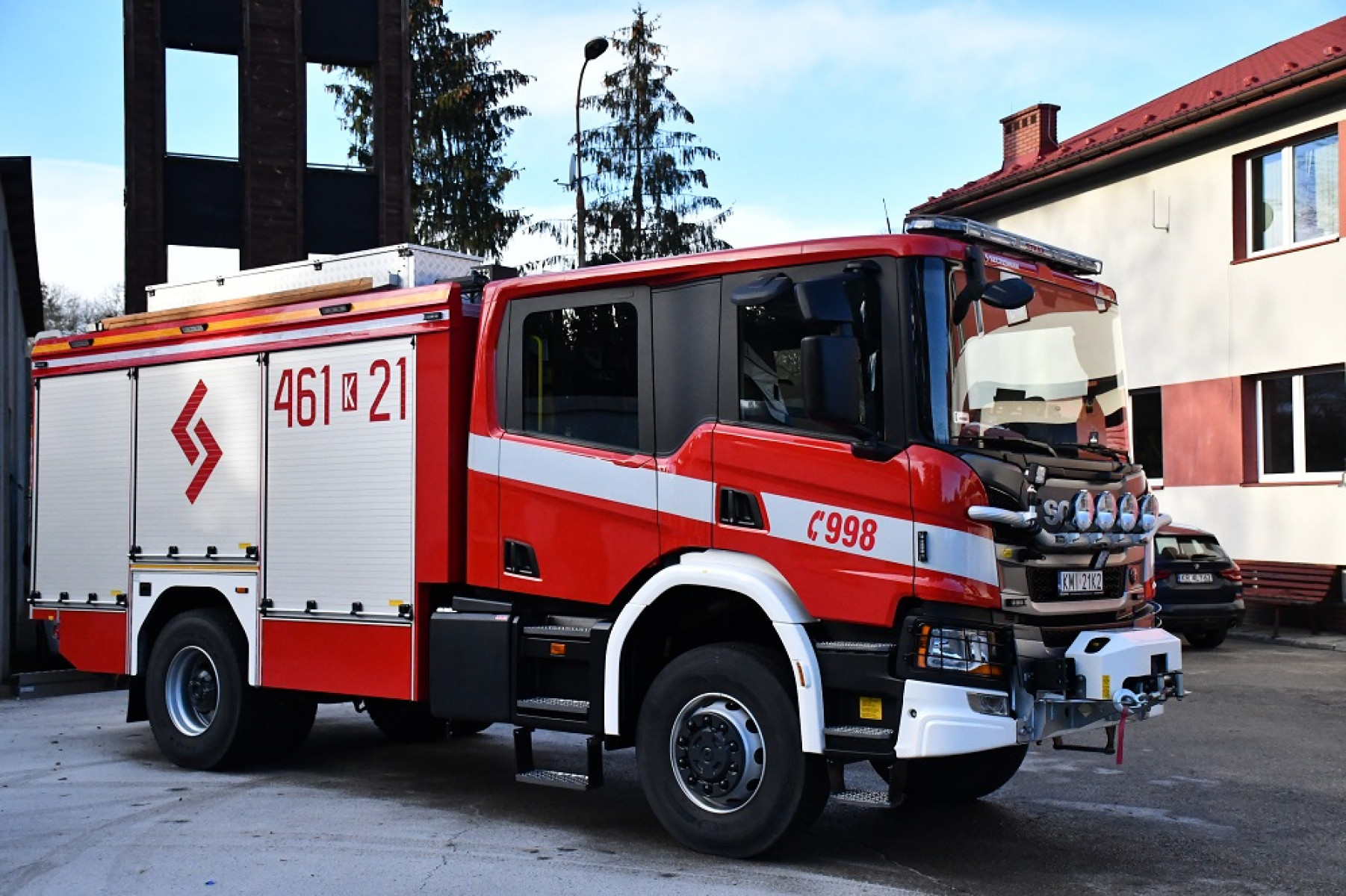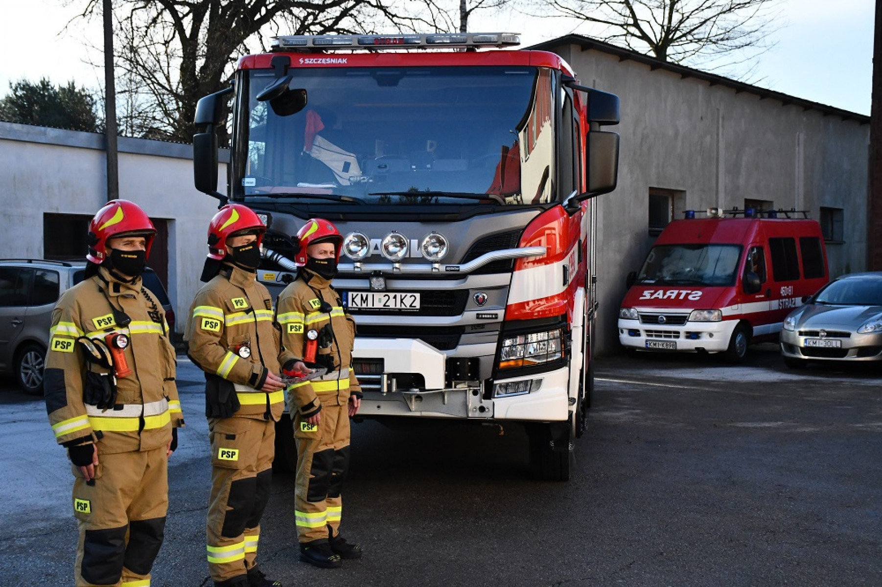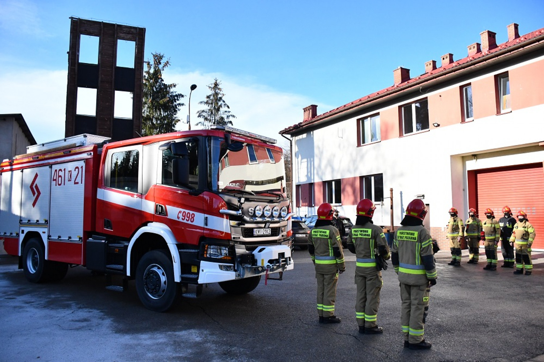 Strażacy z KP PSP Miechów przy nowym średnim wozie bojowym Scania