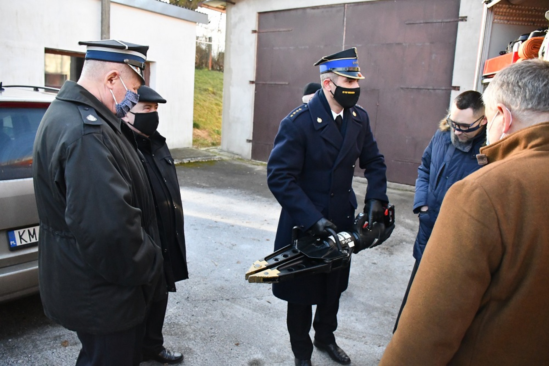 Starosta Jacek Kobyłka, przewodniczący Krzysztof Świerczek i komendant Michał Majda przekazują klucze do nowego wozu