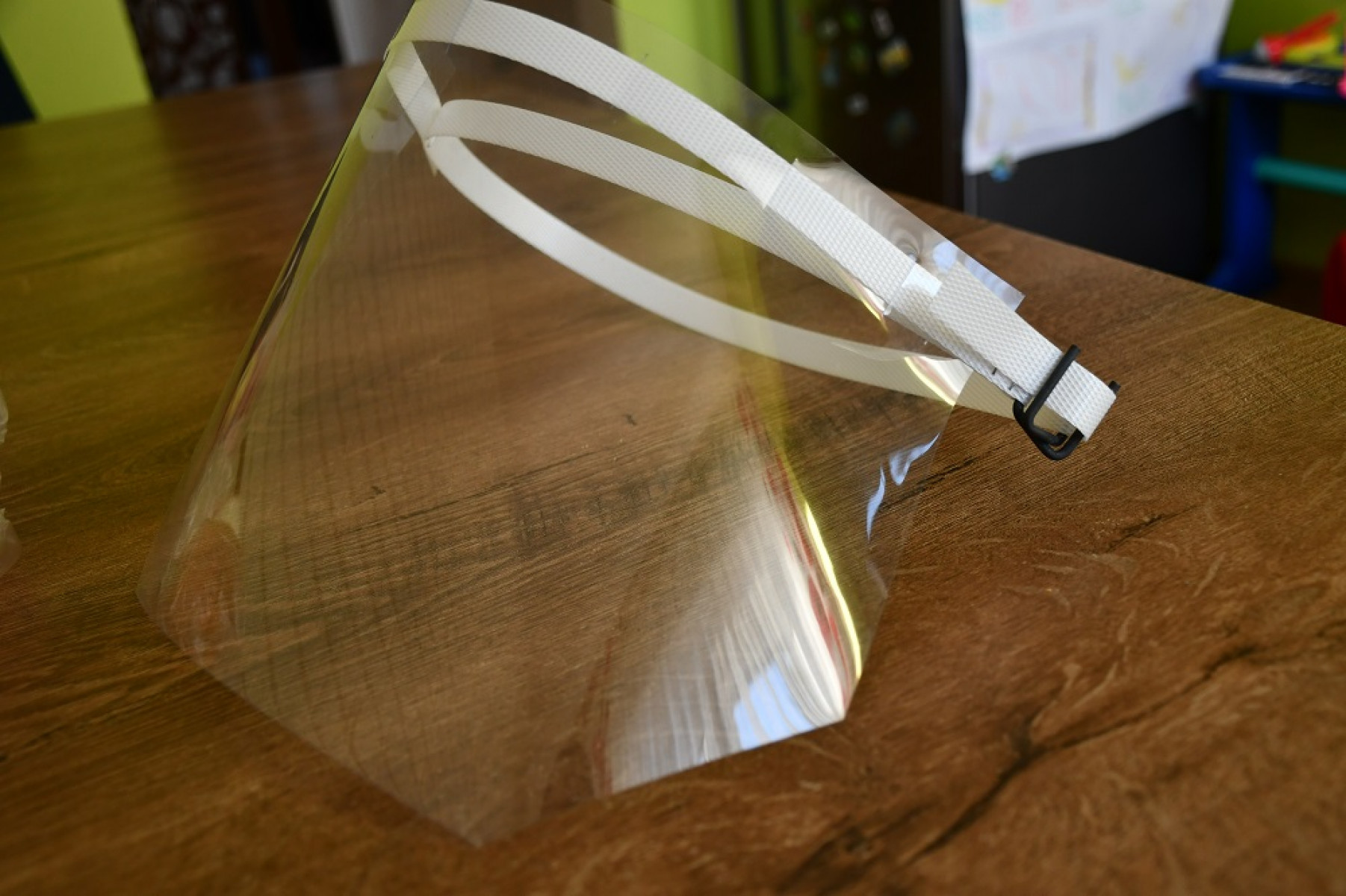 Przyłbica ochronna wytworzona za pomocą folii do bindowania i taśmy polipropylenowej
