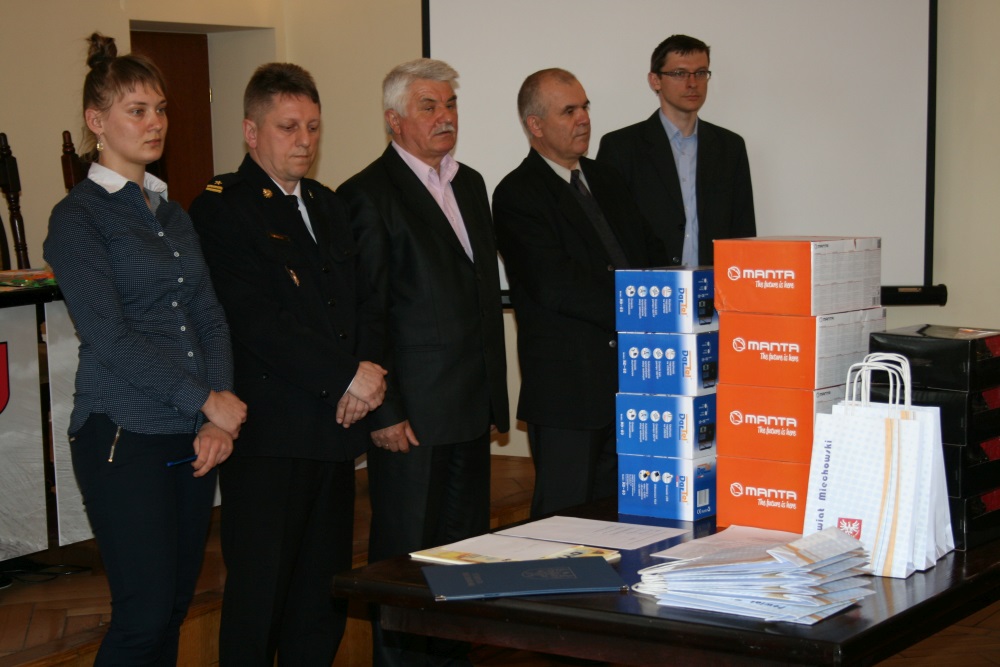 Nagrody rzeczowe ufundowane przez Starostwo Powiatowe w Miechowie wręczali: starosta Marian Gamrat, z-ca komendanta PSP w Miechowie mł. bryg. Mirosław Pogoń i Mirosław Gręda z Referatu Zarządzania Kryzysowego powiatu.