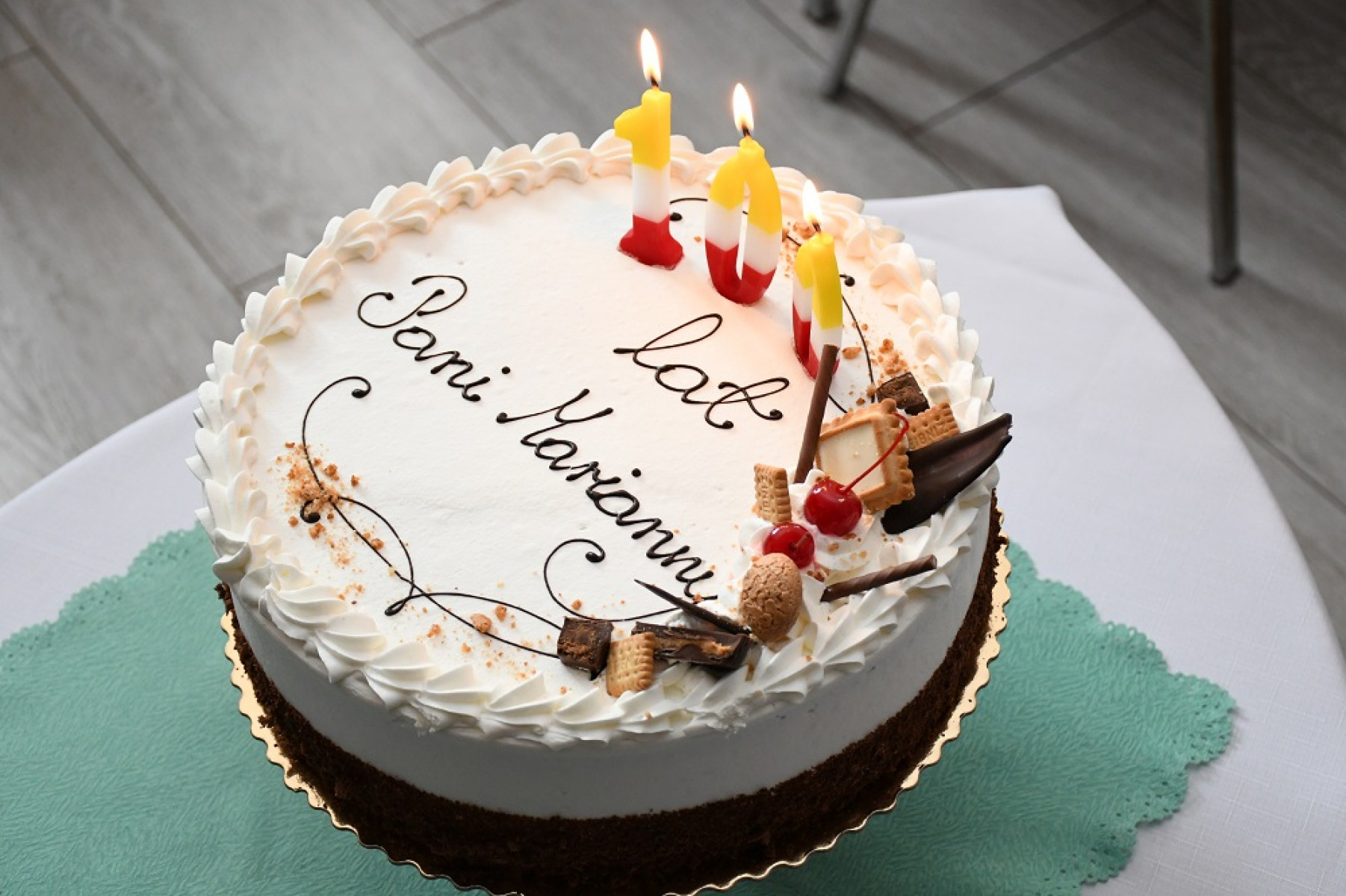Urodzinowy tort Marianny Surma obchodzącej setne urodziny w DPS Dom Kombatanta w Miechowie