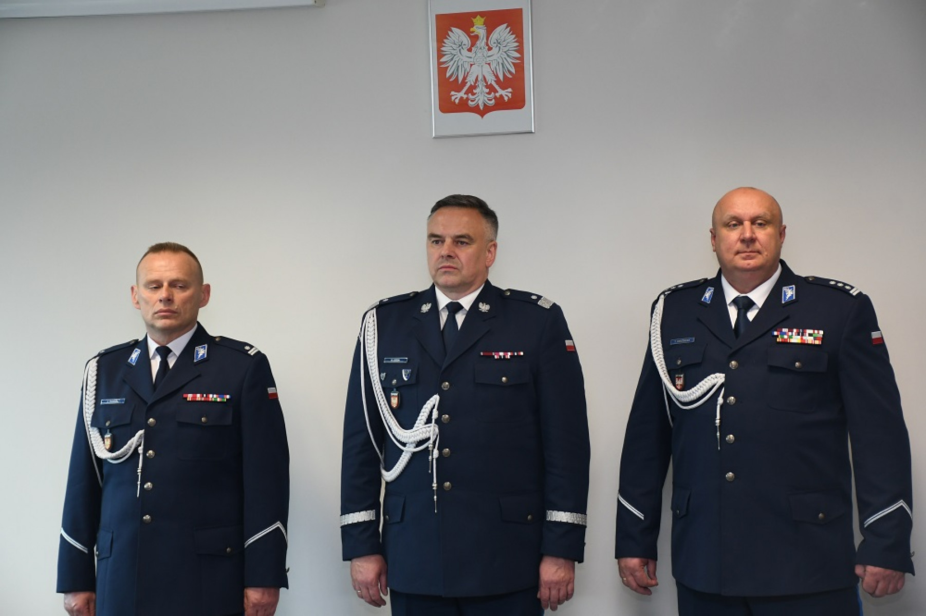 Nowo mianowany komendant powiatowy podinsp. Jacek Rosół z komendantami wojewódzkimi - nadinsp. Michałem Ledzionem i insp. Tomaszem Drożdżakiem