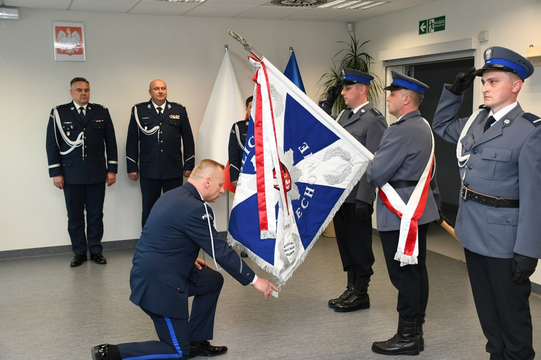 Powitanie sztandaru KPP Miechów przez nowego komendanta podinsp. Jacka Rosoła