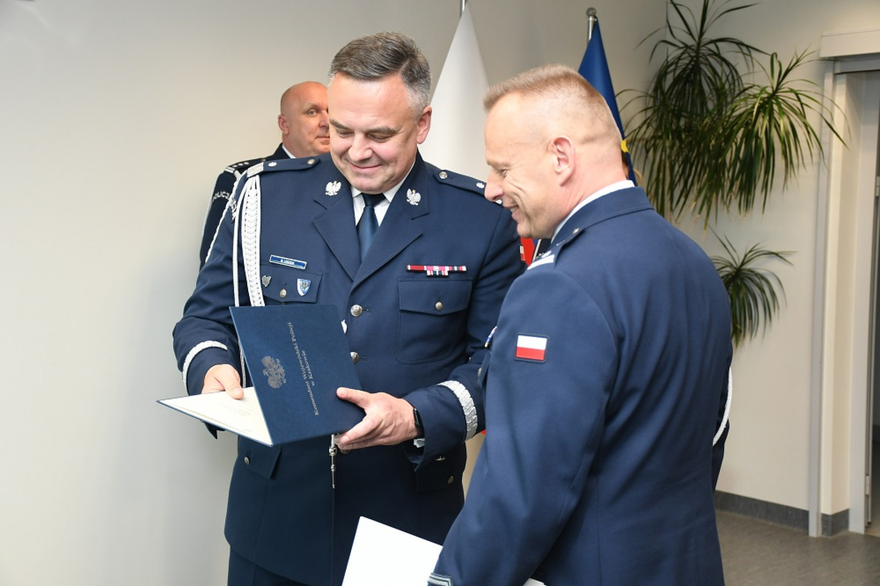 Komendant wojewódzki policji nadinsp. Michał Ledzion wręcza rozkaz mianowania podinsp. Jackowi Rosołowi