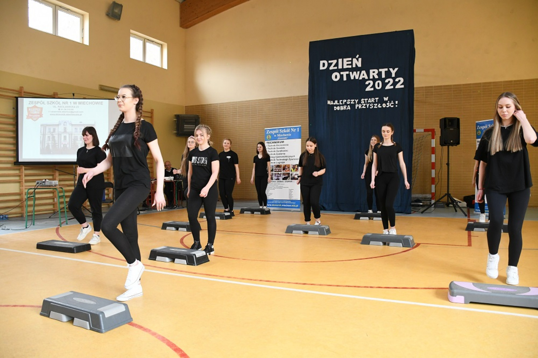 Dzień Otwarty polonezem rozpoczął Szkolny Zespół Tańca „Miechowianie”. Wśród witanych gości przez dyr. Marzenę Samborską, znaleźli się niedoszli absolwenci „podstawówek”, ich dyrektorzy, nauczyciele oraz rodzice, a także członkowie Zarządu Powiatu - Piotr Grządziel i Rafał Pawlik.