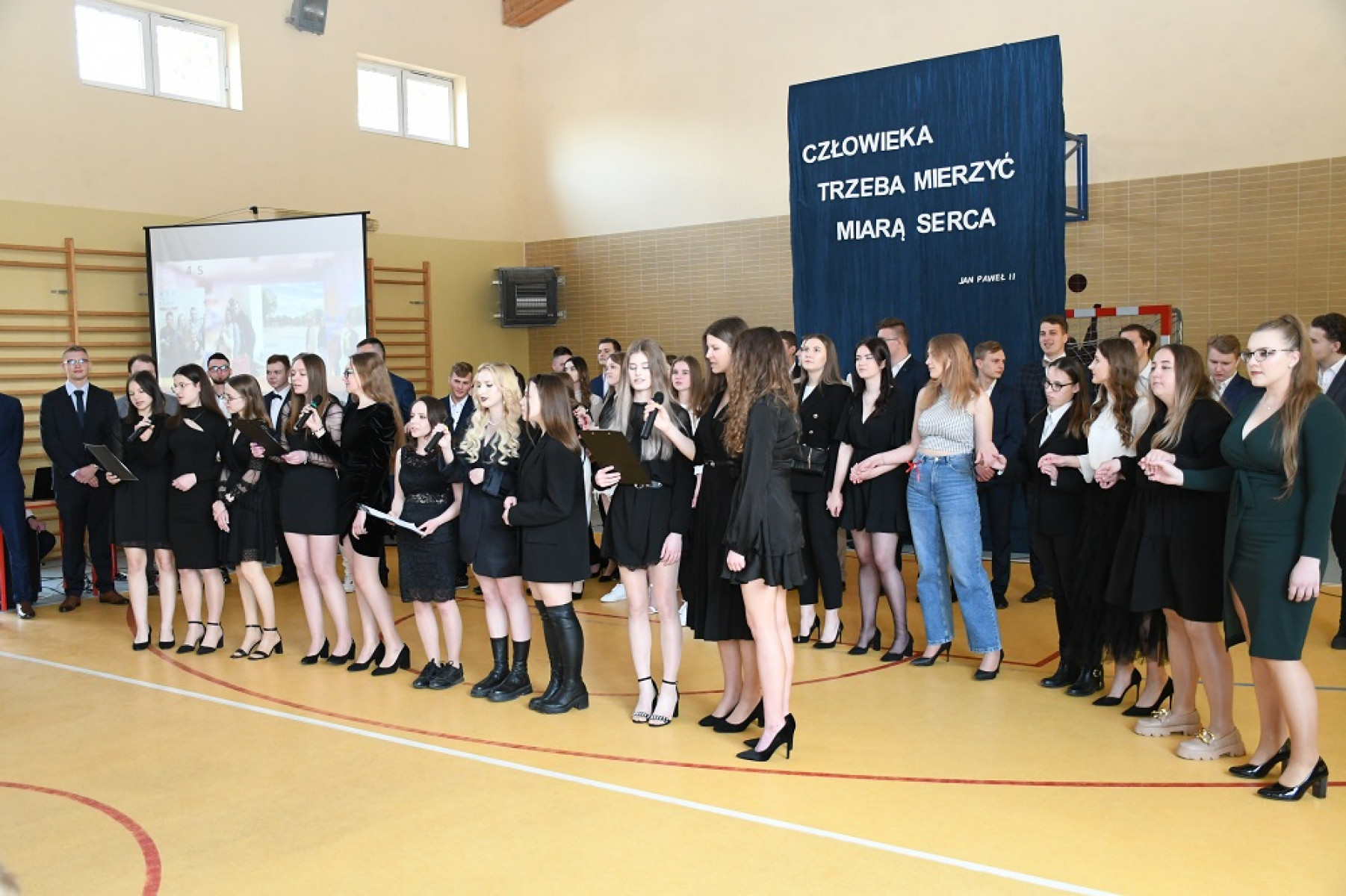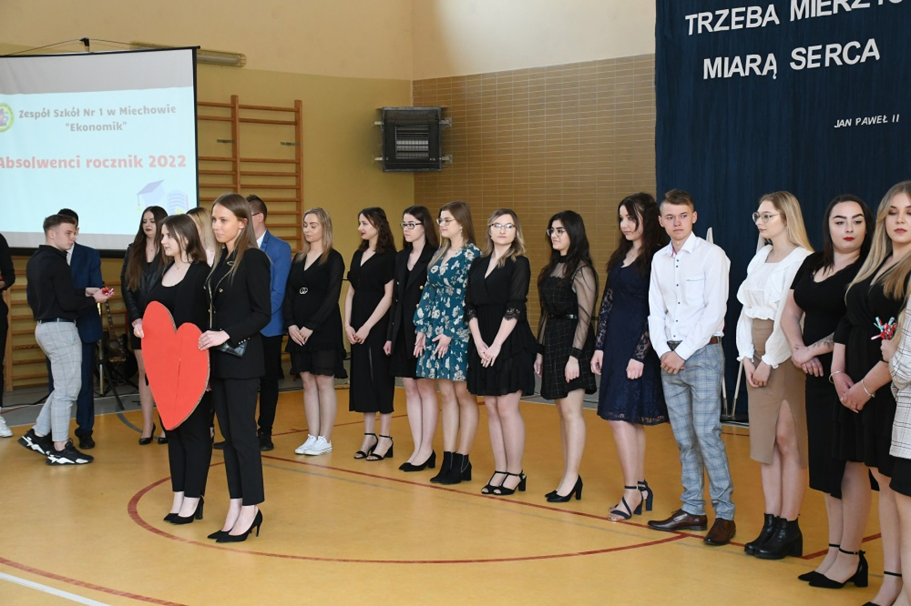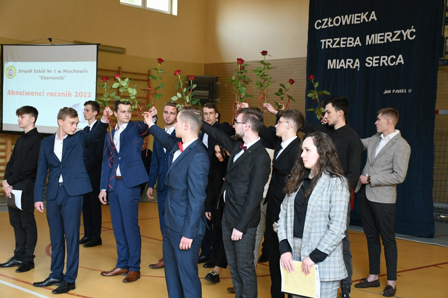 Uroczystej akademii towarzyszyły występy artystyczne, zainaugurowane polonezem przez Szkolny Zespół Tańca „Miechowianie”. Padło wiele słów gratulacji, życzeń i podziękowań, ze strony młodzieży, Rady Rodziców, Samorządu Uczniowskiego, włodarzy powiatu. Dyrektor Marzena Samborska dziękowała zespołowi kierowniczemu szkoły, nauczycielom, a szczególnie wychowawcom maturzystów - Beacie Szarek, Małgorzacie Perczyńskiej, Marii Tyrała, Ewie Skrzyniarz, Annie Szymkiewicz. Podziękowania skierowane były również do młodzieży aktywnie działającej na rzecz rozwoju szkoły, samorządu uczniowskiego, członków Zespołu „Miechowianie” i Zespołu Tańca Nowoczesnego, uczniom z pocztu sztandarowego.