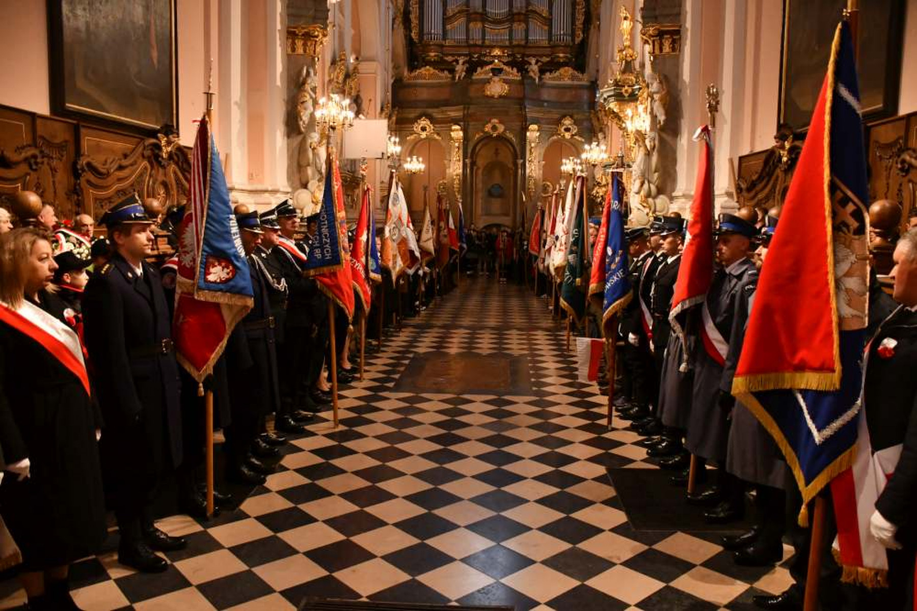 Samorządowcy, goście, komendanci służb i poczty sztandarowe na Mszy św. w miechowskiej bazylice