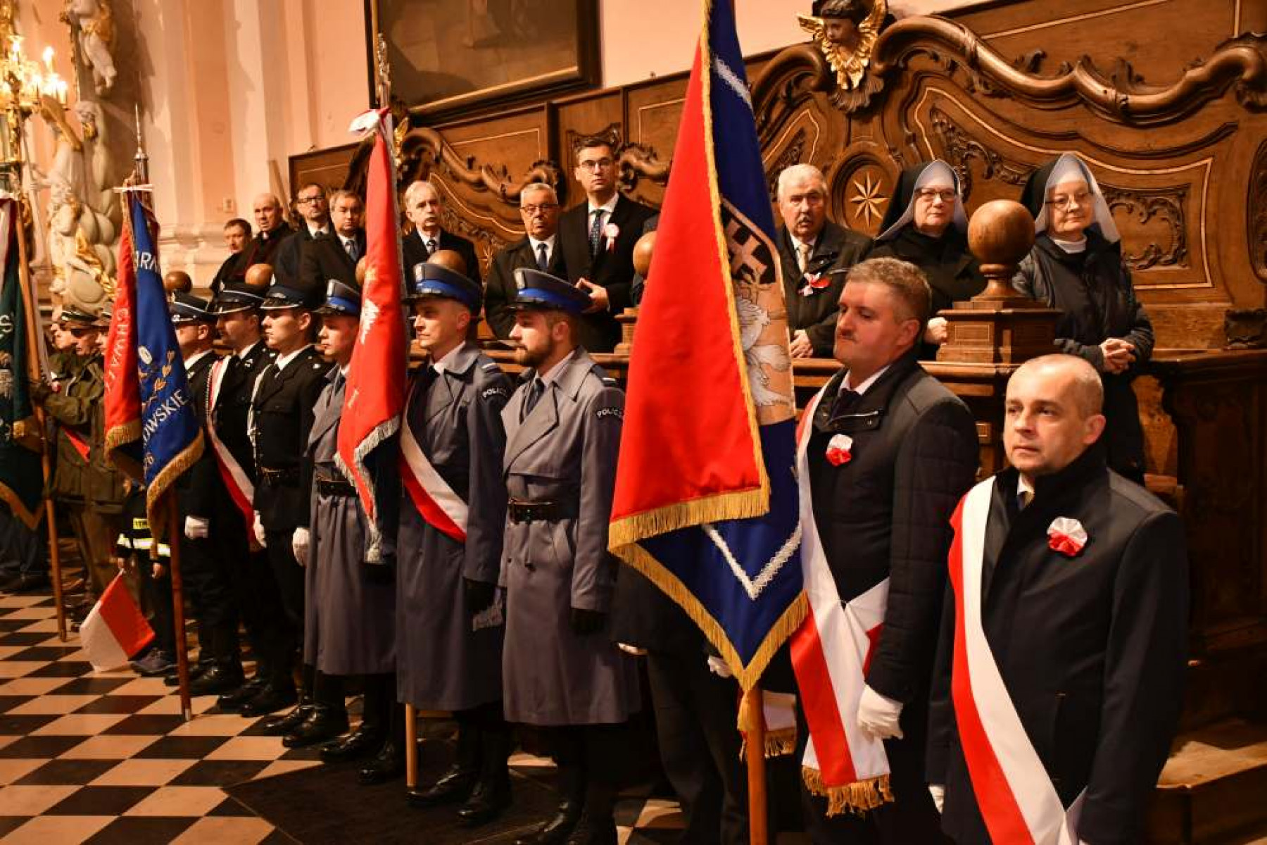 Samorządowcy, goście i poczty sztandarowe na Mszy św. w miechowskiej bazylice