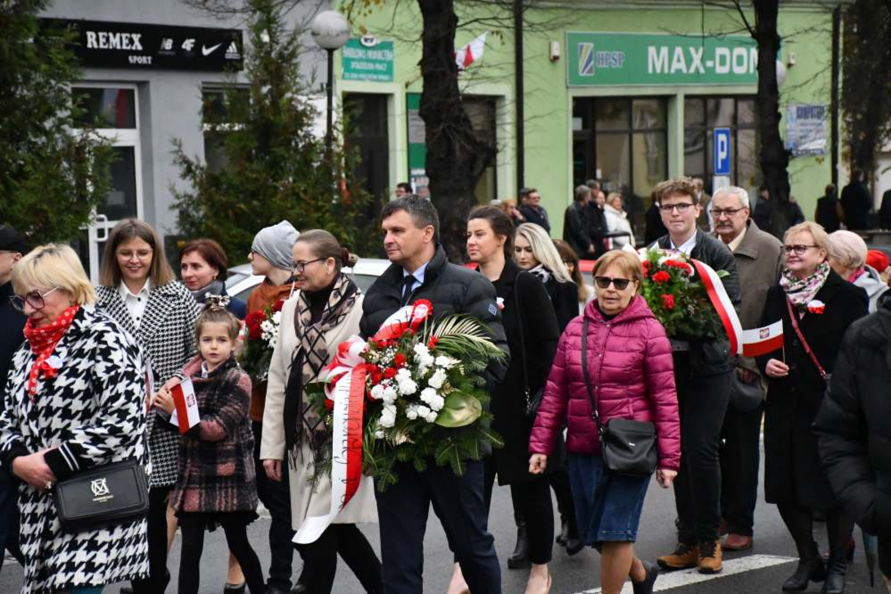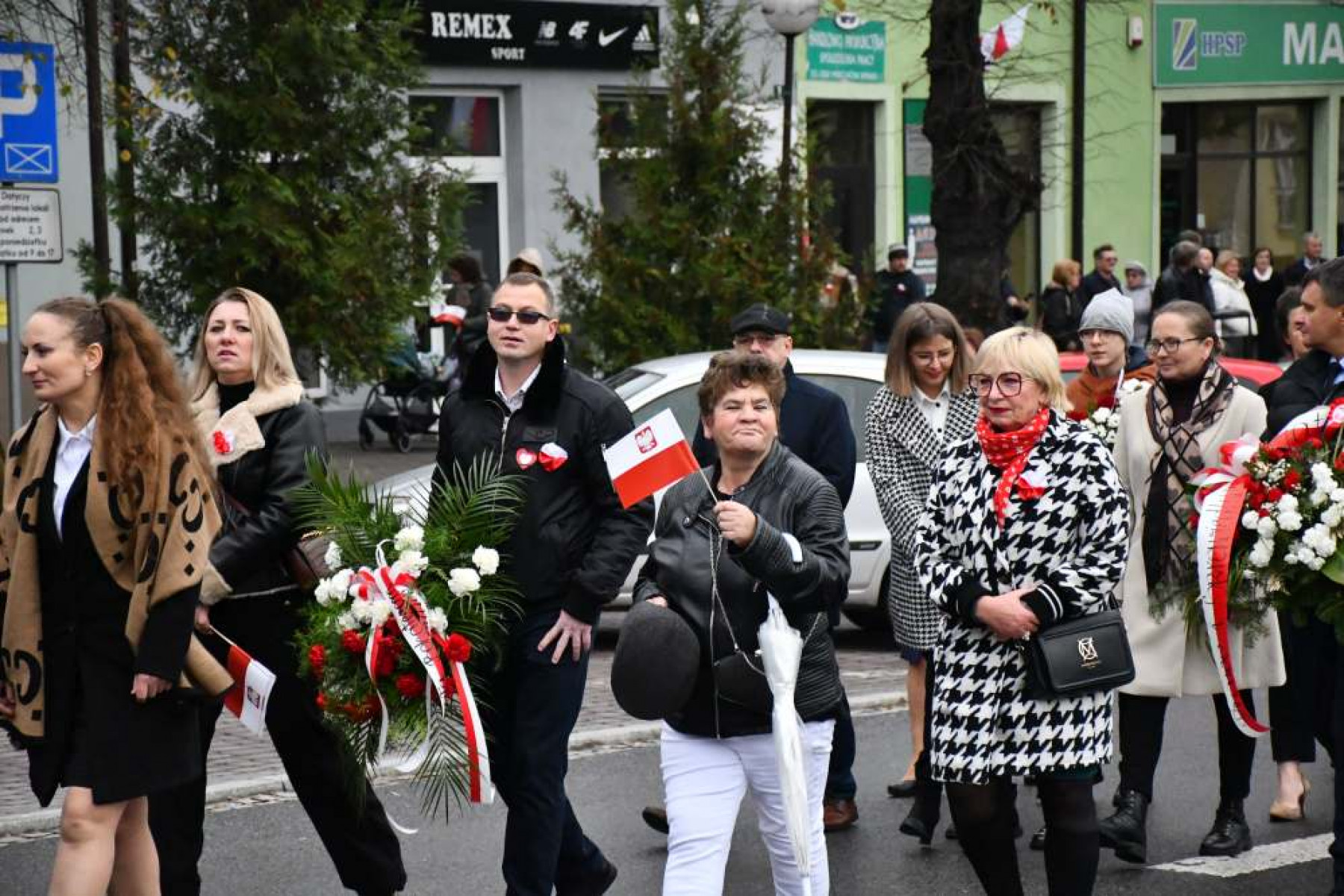11 listopada 2023 w Miechowie - delegacje z kwiatami zmierzają pod Pomnik z Orłem