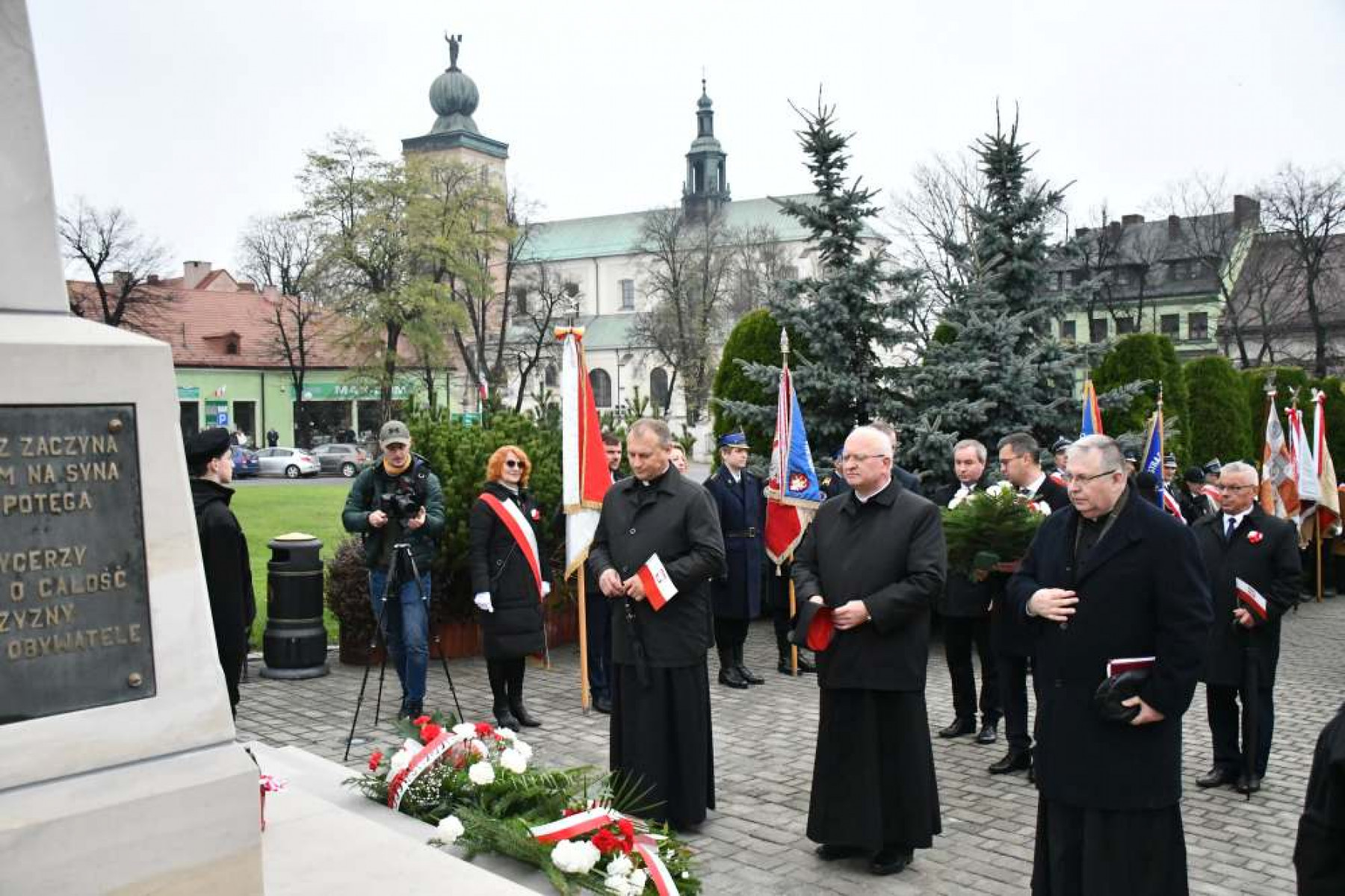 Po Mszy św. licznie zgromadzone poczty sztandarowe, włodarze samorządów powiatowego i gminnego, przedstawiciele szkół, różnych instytucji i organizacji, w asyście orkiestr dętych z Nasiechowic i Sławic prowadzonych przez kapelmistrza Dariusza Pikora, przemaszerowały pod Pomnik z Orłem, by po wciągnięciu flagi i odśpiewaniu hymnu państwowego złożyć hołd walczącym o wolną i suwerenną Rzeczpospolitą. Historię wspomnianego pomnika, który w ostatnim czasie został poddany renowacji, przypomniał Marcin Florek, dyr. Muzeum Ziemi Miechowskiej, a o jego znaczeniu dla wielu pokoleń mówił burmistrz Dariusz Marczewski.