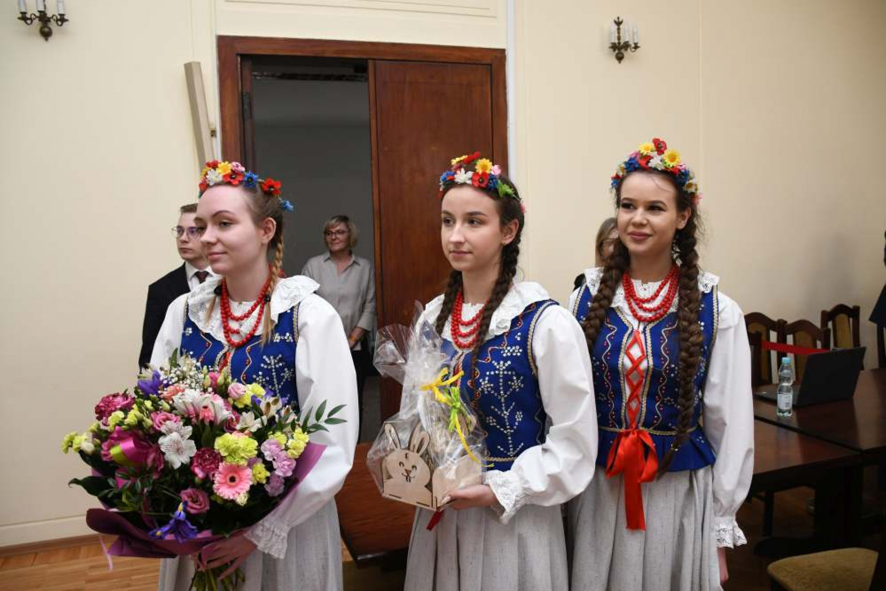 Kwiaty i wielkanocny upominek dla Ministra Andrzeja Adamczyka wręczają dziewczęta ZS Nr 1 w Miechowie