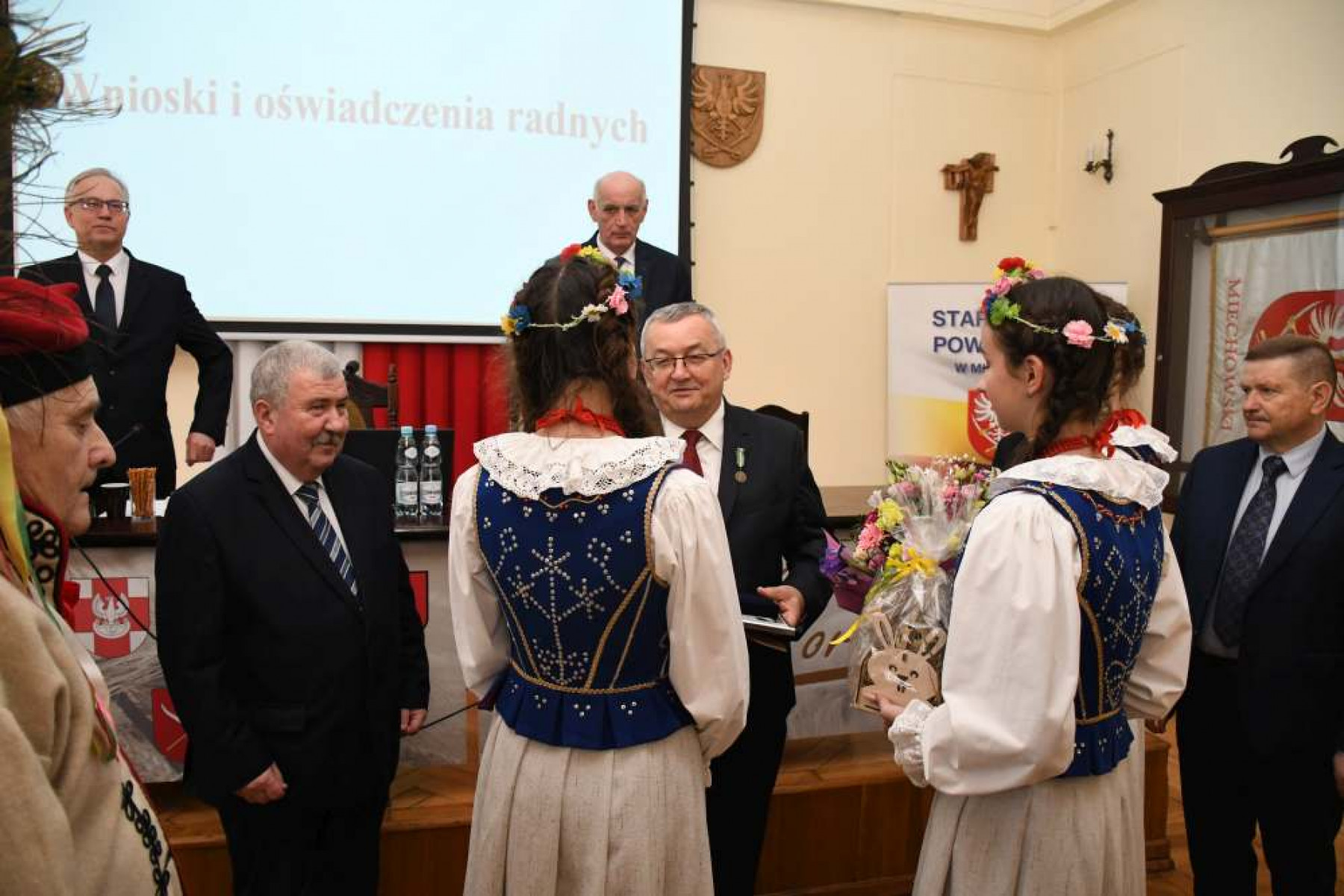 Ministra Andrzeja Adamczyka odznaczyli Starosta Powiatu Miechowskiego - Jacek Kobyłka z Przewodniczącym Rady Powiatu - Krzysztofem Świerczkiem oraz Wójtem Gminy Racławice - Adamem Samborskim. Minister otrzymał również kwiaty i wielkanocny upominek z rąk dziewcząt z Zespołu Szkół Nr 1 w Miechowie ubranych w tradycyjne stroje miechowskie. Data uhonorowania Ministra w miechowskim starostwie była szczególna, bowiem dokładnie 24 marca 1794 roku na Rynku Głównym w Krakowie Tadeusz Kościuszko złożył uroczystą przysięgę inicjującą insurekcję.