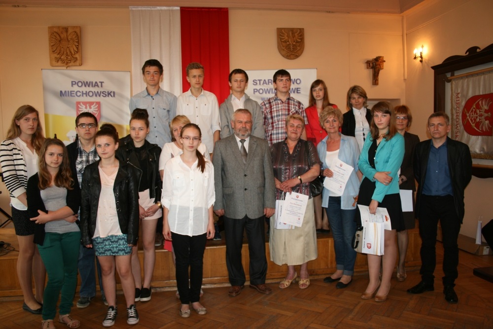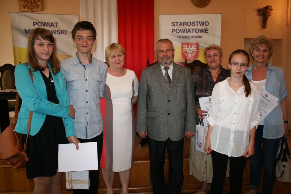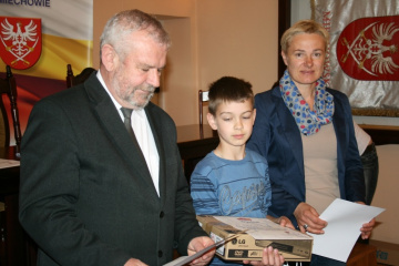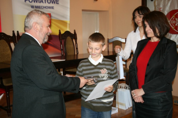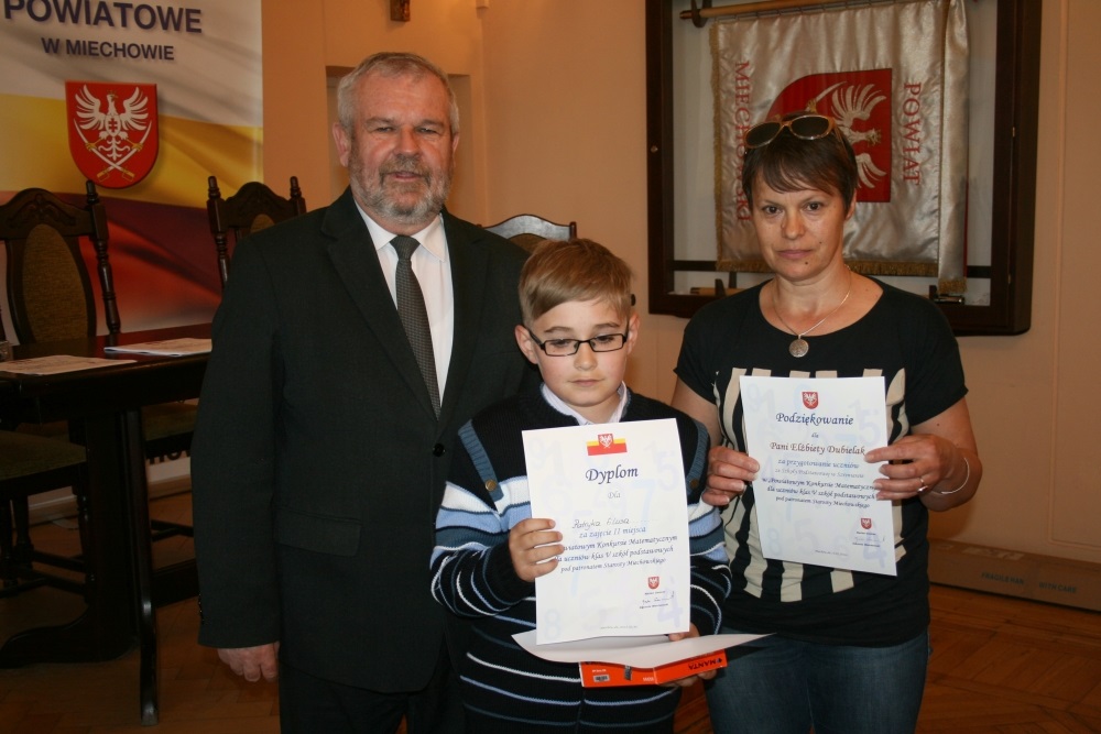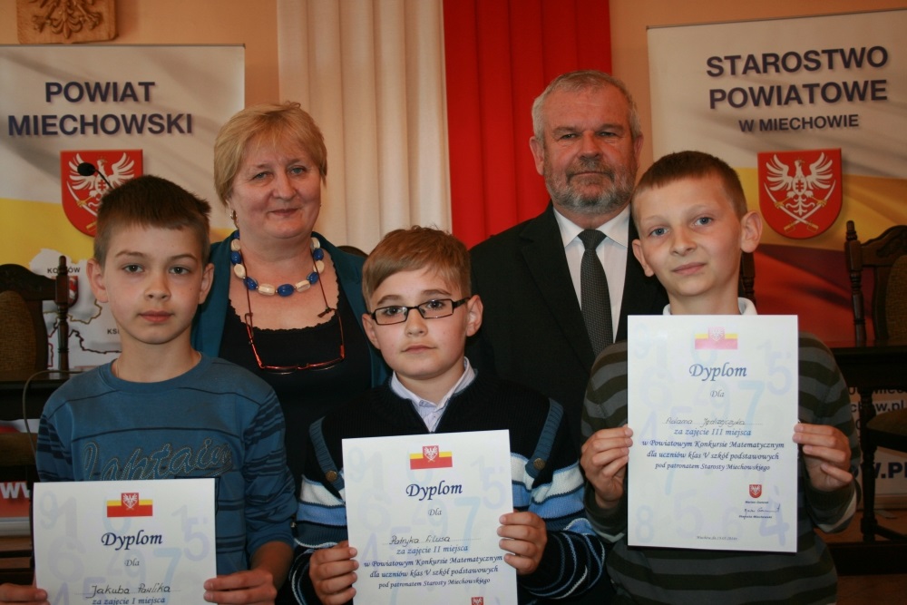 20 Maja 2014(...) Do tegorocznych zmagań matematycznych przystąpiło 99. uczniów z 16. szkół podstawowych powiatu, zaś do etapu finałowego dotarło 16 najlepszych. W czasie godzinnego testu przygotowanego przez doradcę metodycznego p. Halinę Schab, uczniowie rozwiązali 11. zadań opartych na praktyce i wymagających logicznego myślenia. Najlepszymi matematykami – piątoklasistami okazali się: 1. Jakub Pawlik, SP Gołcza - nauczyciel: Dorota Gamrat; 2. Patryk Filus – SP Szreniawa – nauczyciel: Elżbieta Dubielak i 3. Adam Jędrzejczyk – SP Wysocice - nauczyciel: Marta Wcisło. W opinii metodyka Haliny Schab, organizatorki kolejnej edycji konkursu, z roku na rok zwiększa się zainteresowanie poznawaniem tajników matematyki wśród uczniów. – Zauważa się coraz większe zaangażowanie uczniów i nauczycieli matematyki, uczestnicy konkursu w większości uzyskują wysoką punktację, a nagrody, wyróżnienia i satysfakcja z wykazanych umiejętności stanowią motywację do dalszego zgłębiania matematyki. Ponadto duże zainteresowanie naszym konkursem obala mit o hermetyczności matematyki – podsumowała Halina Schab. Zwycięzcy otrzymali od starosty i metodyka nagrody ufundowane przez miechowskie starostwo, zaś wszyscy finaliści dyplomy i pakiety promocyjne powiatu. Finał dla gimnazjalistów ww. konkursu wygrali: Tomasz Chuma z gimnazjum w Książu Wielkim, Katarzyna Syguła z gimn. w Gołczy i Joanna Szumerowska z gimn. w Książu Wielkim. W rywalizacji gimnazjów najlepsza okazała się szkoła w Książu Wielkim przed Gołczą i Racławicami. Od strony organizacyjnej przebieg konkursu koordynowali Beata Kwiecińska i Michał Rak z Wydziału Oświaty, Kultury i Sportu. Dodatkową atrakcją dla uczestników konkursu było zwiedzanie bazyliki Grobu Bożego i Muzeum Ziemi Miechowskiej.