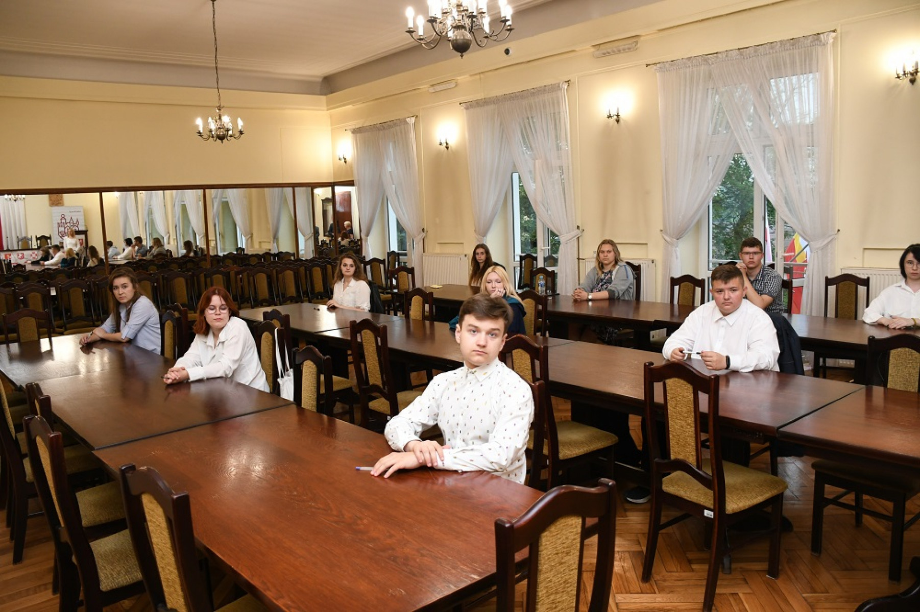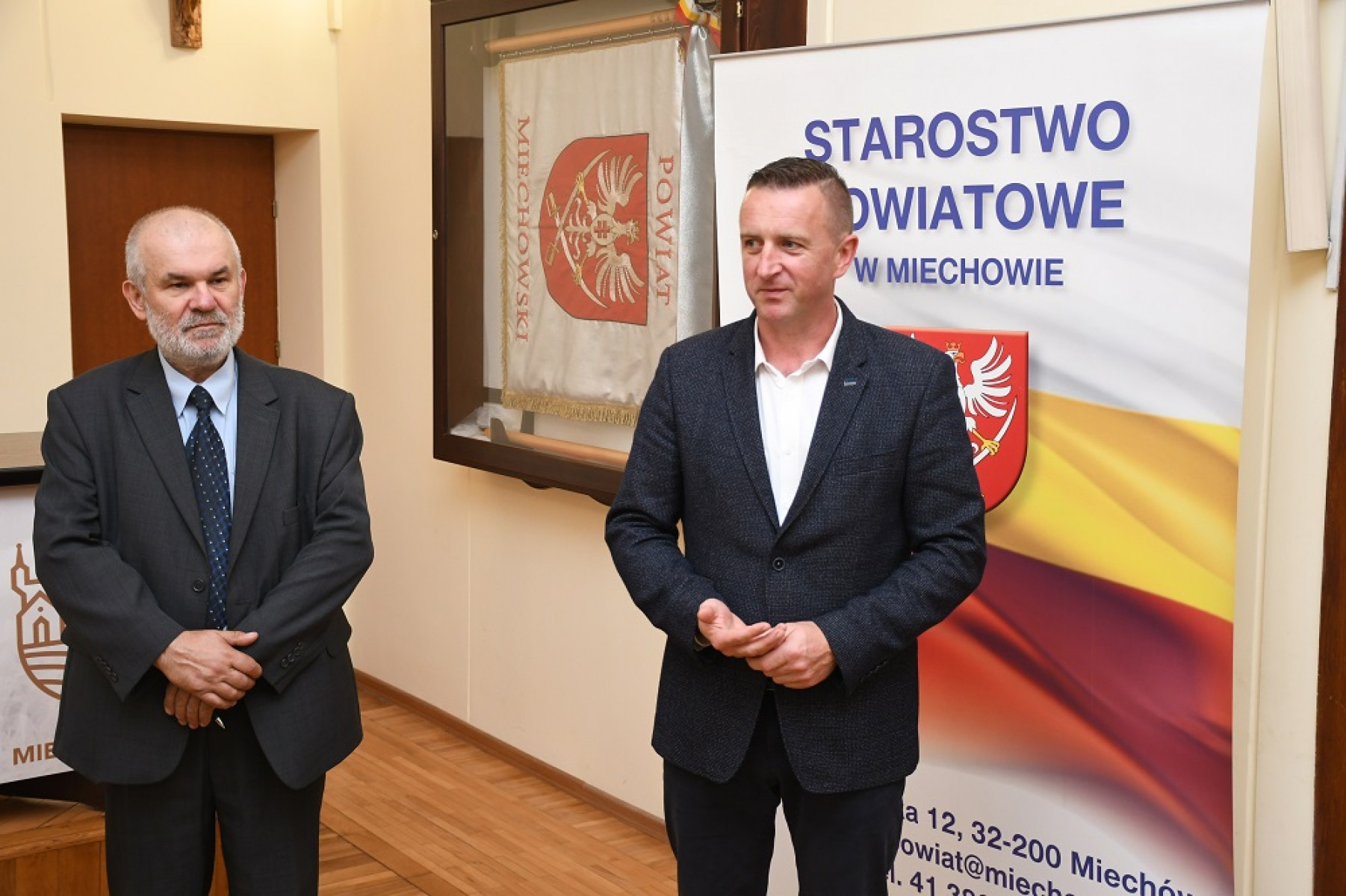 Wicestarosta Paweł Osikowski i Naczelnik Leonard Mazur życzą powodzenia uczestnikom konkursu o związkach Ziemi Miechowskiej z Jerozolimą
