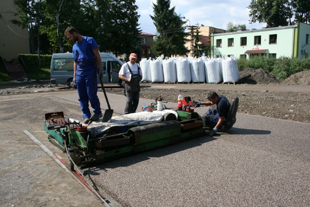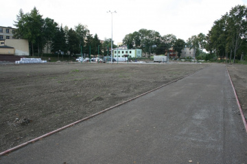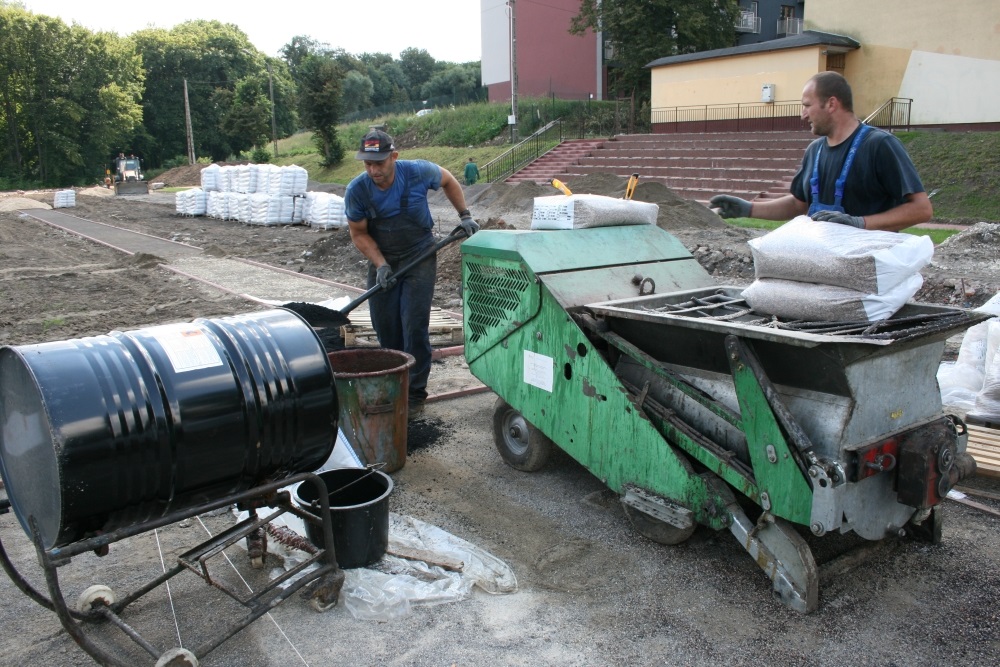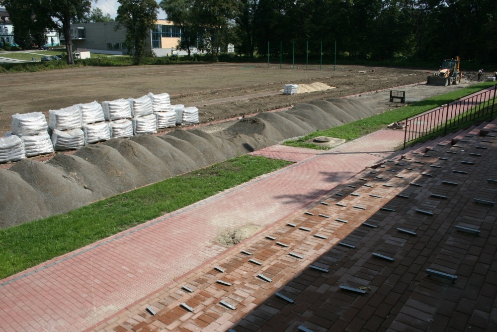Pierwsze od połowy lat sześćdziesiątych ubiegłego wieku prace przy modernizacji tego obiektu wkraczają w decydująca fazę. Pracownicy wykonawcy, Usługi Remontowo – Budowlane Adam Dudziński z Miechowa, na obszernym terenie wydzielili i przygotowali wszystkie miejsca pod nowe boiska do piłki nożnej, piłki ręcznej, siatkówki i koszykówki. Wyznaczone są bieżnie 400 m. i 100 m, rozbieg do skoczni w dal i plac do pchnięcia kula. Prawie gotowe są trybuny, chodnik i schody, zamontowany jest nowy łup oświetleniowy. Uwagę zwracają wielkie worki ze syntetycznym granulatem barwnym, rozdrobnioną gumą i beczki z żywicą. Składniki te są mieszane, a specjalna maszyna obecnie wylewa i układa z nich elastyczne nawierzchnie boisk (później także bieżni i skoczni). Wyjątkiem jest boisko piłkarskie trawiaste. Pod nim, jak i pod bieżniami położono instalację odwadniającą. Przed firmą wykonawczą także prace nad ogrodzeniem całego terenu i montażem bramy przesuwnej. W miejscach po wcześniej wyciętych drzewach i krzakach posadzona zostanie trawa.