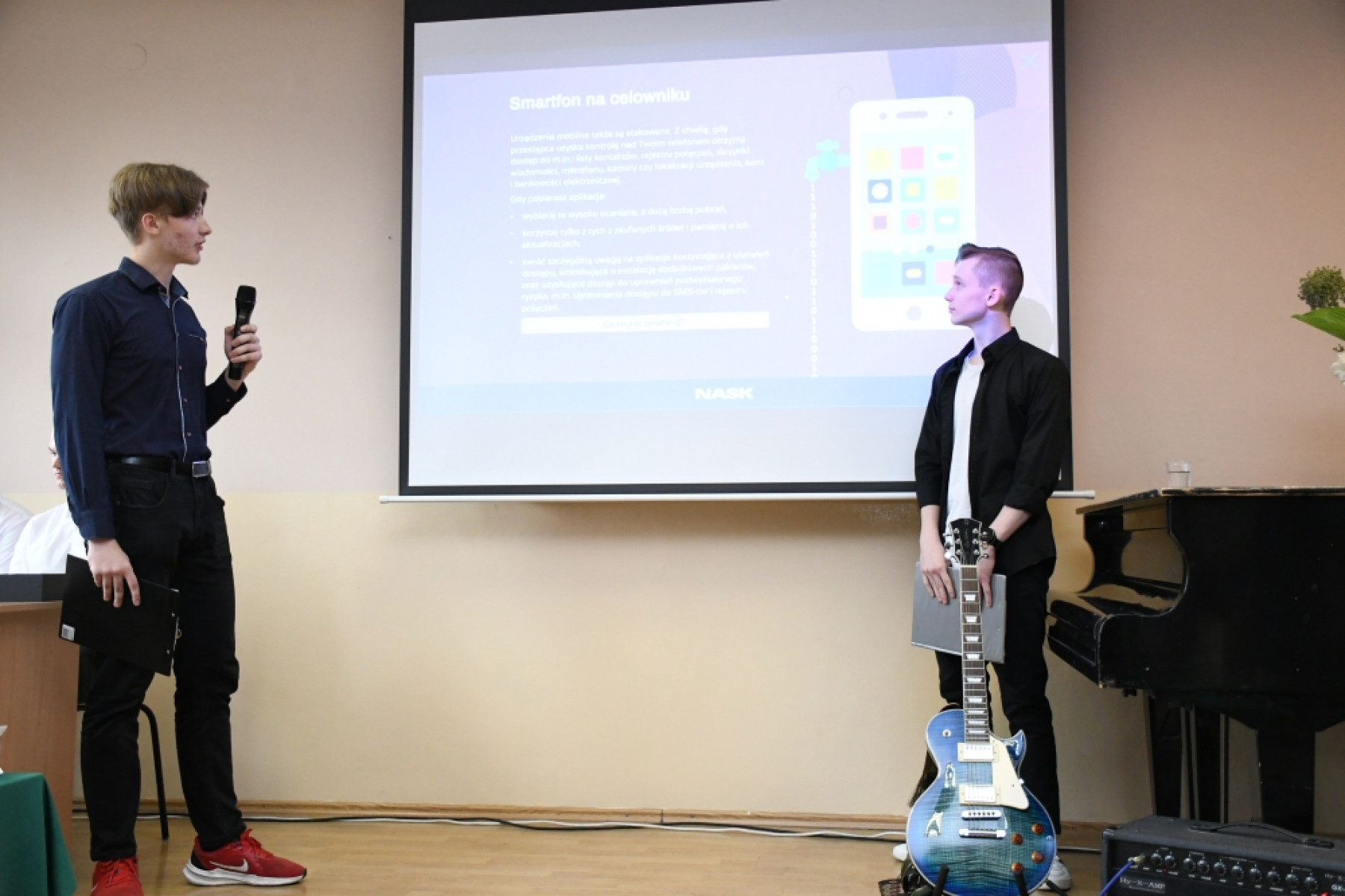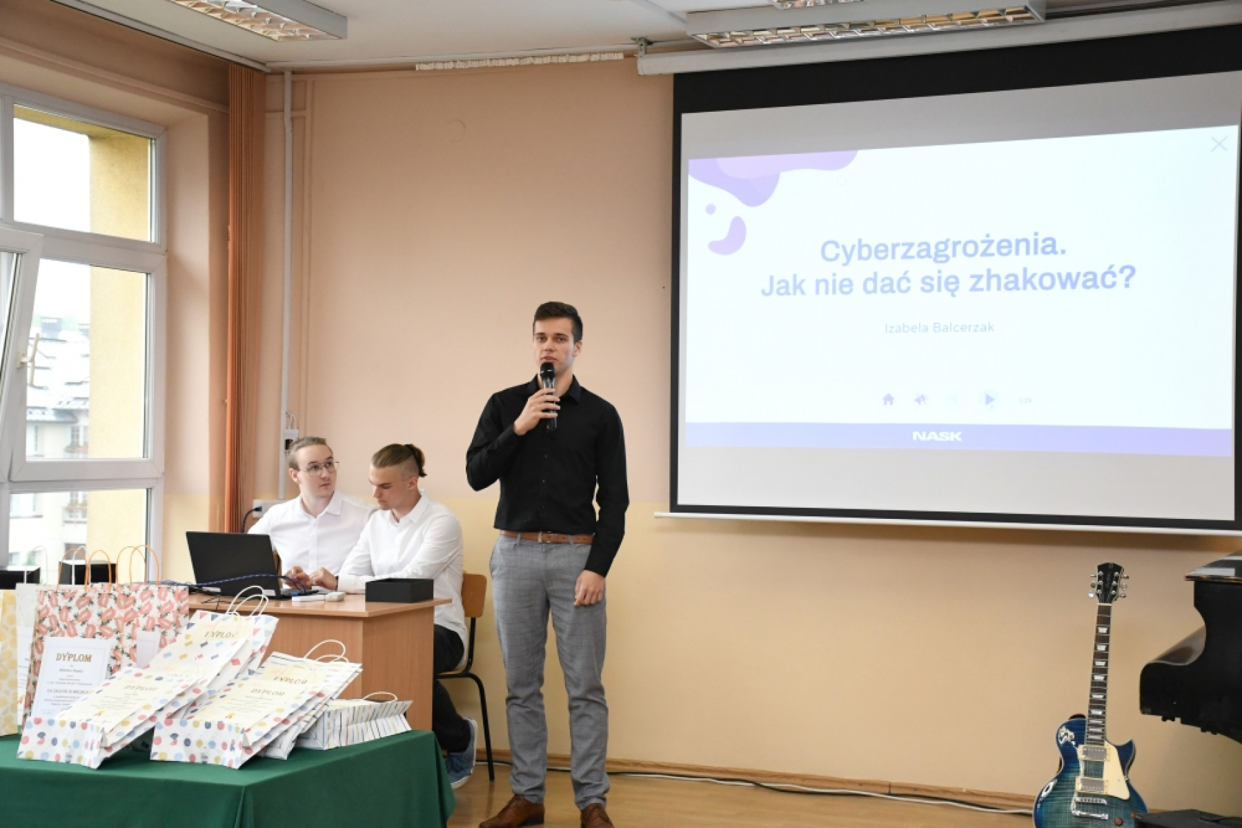Po krótkim wstępie uczniowie trzeciej klasy o profilu matematyczno - informatycznym - Bartłomiej Piotrowski, Przemysław Juszczyk, Bartłomiej Kubacki, Daniel Rumiantsev wystąpili z prezentacją “Cyberzagrożenia. Jak nie dać się zhakować”, podczas której przedstawili wiele interesujących faktów, ciekawostek i wskazówek, na co uważać w czasie korzystania z zasobów Internetu.