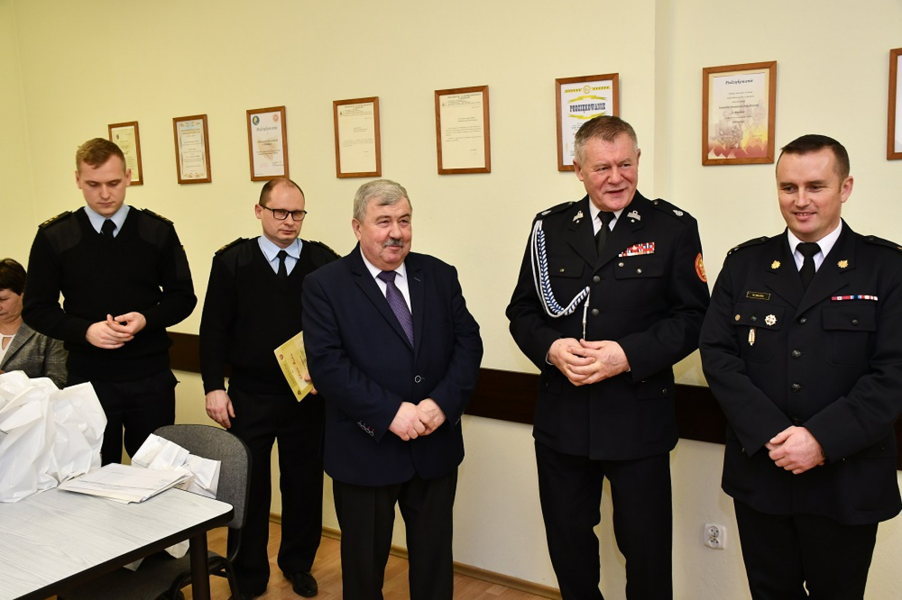 Starosta Jacek Kobyłka w towarzystwie komendanta KP PSP Miechów i prezesa ZOSP RP