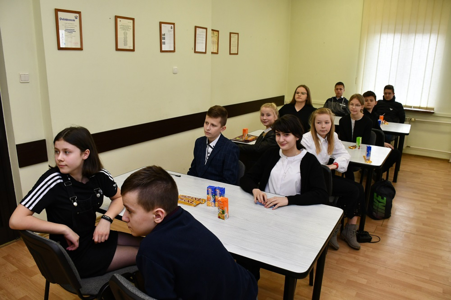 Uczestnicy powiatowej odsłony Ogólnopolskiego Turnieju Wiedzy Pożarniczej w KP PSP Miechów w oczekiwaniu na wyniki