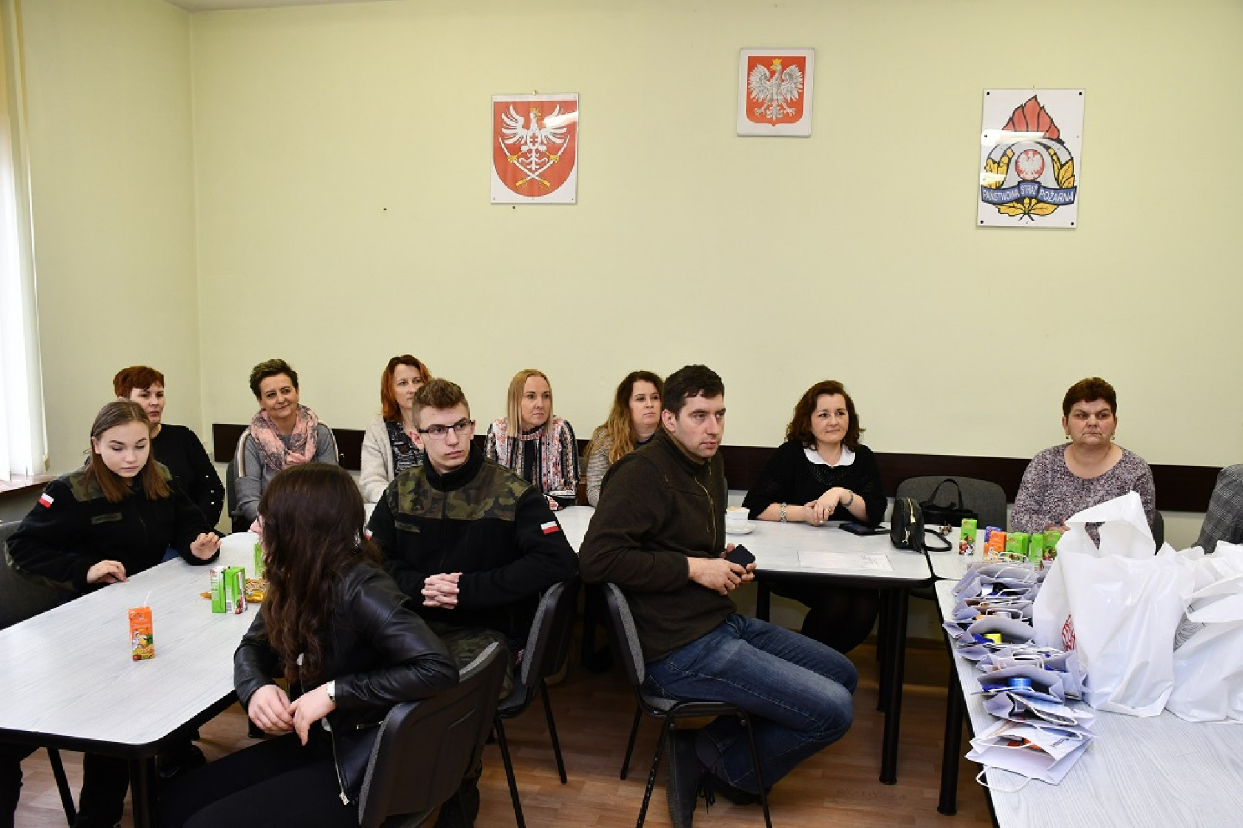 Opiekunowie uczniów startujący w turnieju pożarniczym w KP PSP Miechów