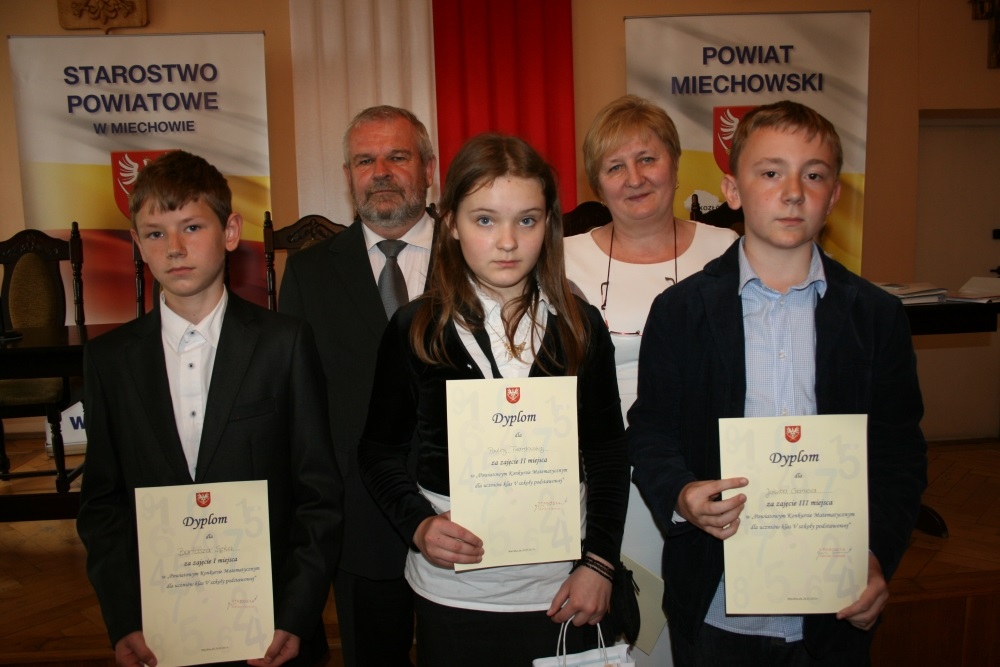 21 Maja 2013(...) Jego pomysłodawczyni – Halina Schab, metodyk – matematyk, informowała, powiedziała, że istotą konkursu jest popularyzacja matematyki już u najmłodszych uczniów. Dodała, że w I etapie rywalizacji udział wzięło 102. piątoklasistów z 13. szkół podstawowych z powiatu miechowskiego. W finale spotkało się 13. najlepszych młodych matematyków. Zwyciężył Bartosz Sęk - SP Gołcza. Dwa kolejne miejsca zajęli: Paulina Twardowska – SP Nr 1 Miechów i Jakub Garus – SP Miechów – Charsznica. Nagrody ufundowane przez starostwo – sprzęt elektroniczny i zestawy książkowe odebrali zwycięzcy, zaś wszyscy uczestnicy otrzymali dyplomy i materiały promocyjne powiatu. Wyróżniono również nauczycieli przedmiotu, opiekunów młodocianych matematyków.