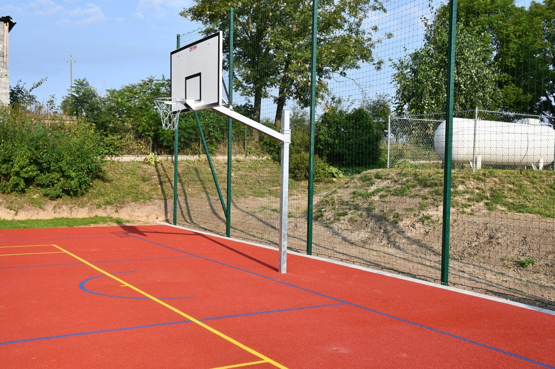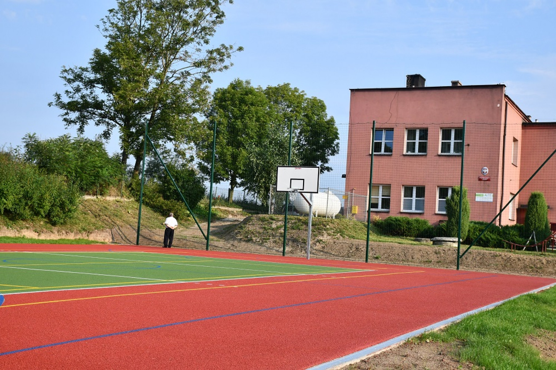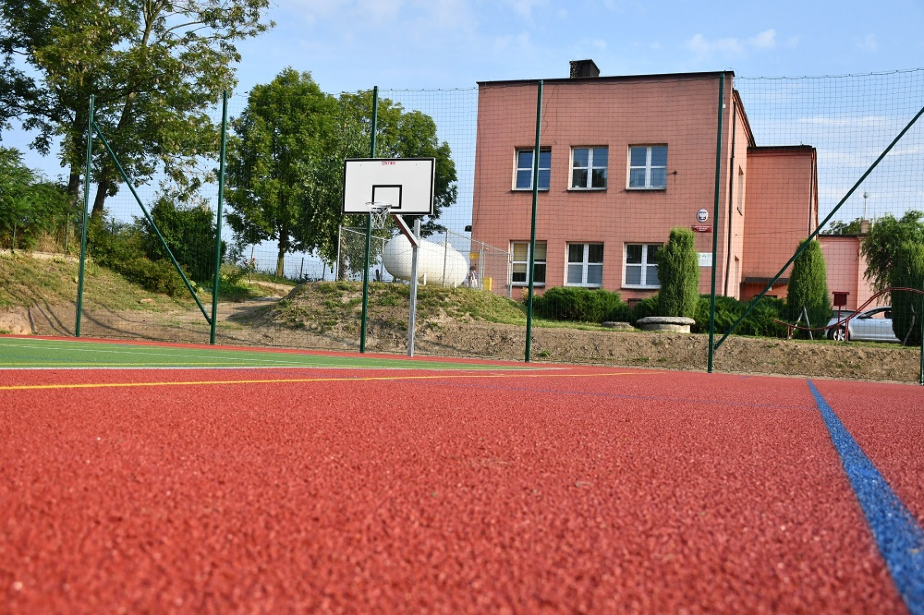 Zadanie wykonane zostało niemal w ekspresowym tempie, bowiem rozpoczęło się 10 lipca. W ramach jego realizacji wykonano przebudowę boiska trawiastego na boisko o wymiarach 19x32 m o nawierzchni bezpiecznej poliuretanowej. Jest to boisko wielofunkcyjne. Można grać na nim zarówno w koszykówkę, piłkę siatkową oraz tenisa. Poszczególne boiska oznaczone są kolorowymi pięciocentymetrowymi liniami. Boiska do piłki koszykowej oraz do piłki siatkowej zostaną wyposażone w sprzęt umożliwiający prowadzenie na nich zajęć i rozgrywek sportowych. Dodatkowo wykonano odwodnienie terenu od strony budynku szkoły zabezpieczające boisko przed zalewaniem i zamulaniem jego powierzchni w trakcie ulewnych deszczy.