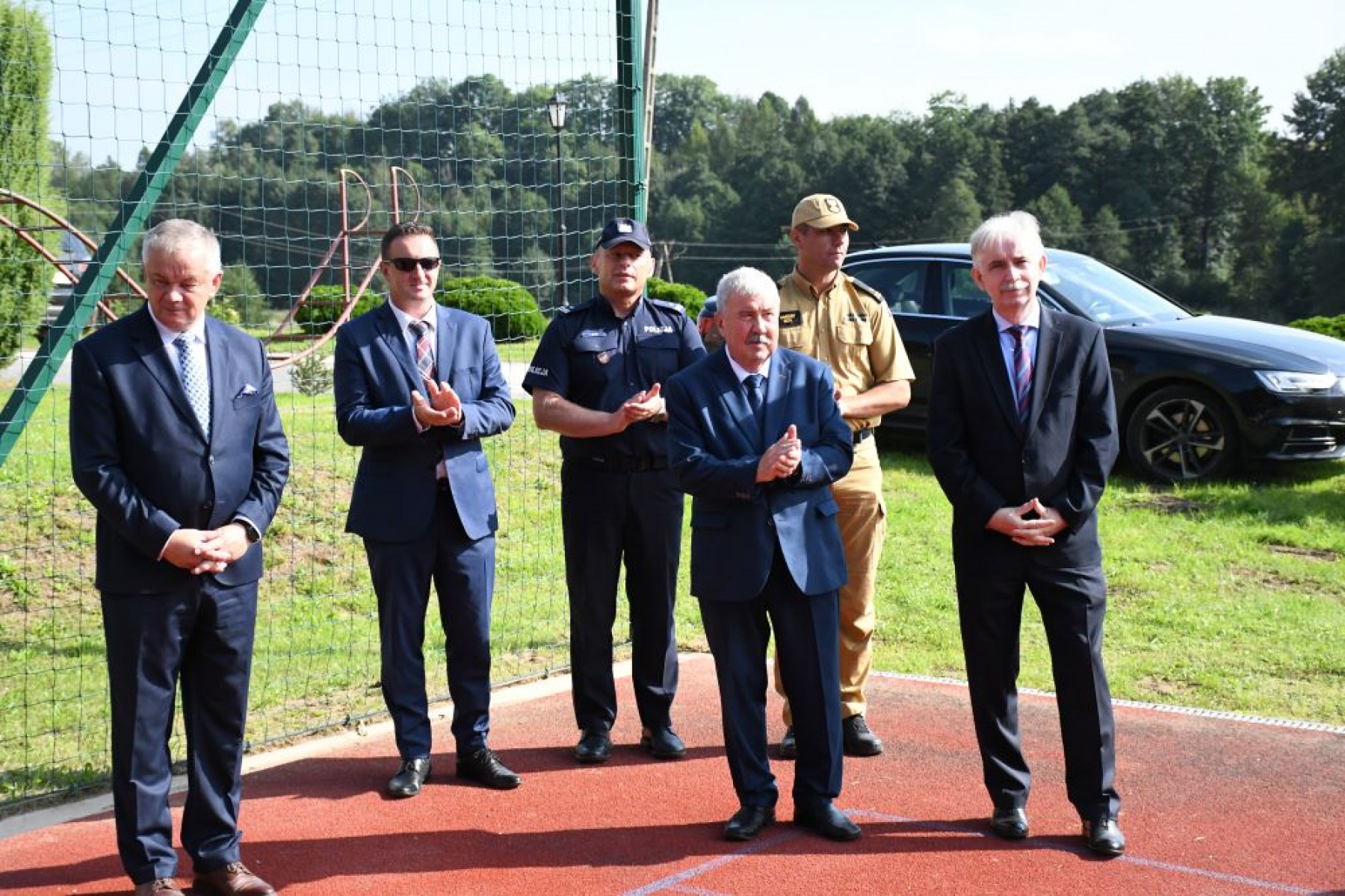 Włodarze Powiatu Miechowskiego i komendanci służb na otwarciu roku szkolnego w Zagorzycach