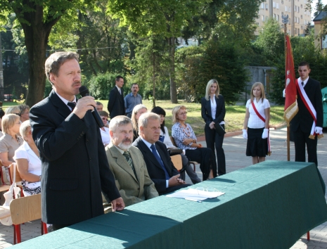 (...) W uroczystościach inaugurujących nowy rok edukacji we wszystkich placówkach oświatowych uczestniczyli przedstawiciele kierownictwa powiatu. Były słowa powitania i życzenia efektywnej nauki ze strony dyrektorów szkół i gości skierowane do uczniów i pedagogów. Starosta Mieczysław Bertek był gościem dyrekcji, nauczycieli i młodzieży Zespołu Szkół Nr 1 w Miechowie, w której rozpoczęło edukację aż 717 uczniów, w tym 187 pierwszoklasistów. Wicedyrektor Władysław Mastrzykowski zachęcił uczniów do całorocznego wysiłku i zadeklarował wszelką pomoc kadry pedagogicznej w zdobywaniu i pogłębianiu wiedzy. Ze słowami szczególnego powitania zwrócił się do uczniów klas pierwszych, zaś do tegorocznych maturzystów z apelem o solidne przygotowanie się do egzaminu dojrzałości. Nie zabrakło informacji o wakacyjnych remontach w szkole (m.in. wymianie okien, remoncie stołówki i kuchni, modernizacji sali komputerowej) i wsparciu niektórych z tych prac przez organ prowadzący - powiat miechowski. Starosta życzył młodzieży skutecznej nauki i apelował o życiowy rozsądek. Powiedział także, że budowa nowej sali gimnastycznej przy Zespole jest coraz bardziej realna. W przypadku dofinansowania kosztów jej powstania ze środków unijnych inwestycja rozpocznie się w przyszłym roku. Rozpoczęcie roku szkolnego zakończyły spotkania uczniów z wychowawcami klas.