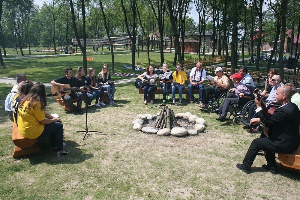 Oficjalnie otwarcie Parku Sensorycznego w Miechowie zgromadziło społeczność tej placówki, pensjonariuszy i pedagogów różnych placówek opiekuńczo-wychowaczych, przedstawicieli lokalnych samorządów, dyrektorów szkół, przyjaciół DPS przy ul. Warszawskiej. Okolicznościową mszę ,,pod naturalnym parasolem drzew” odprawił ks. kapelan Stanisław Latosiński, nawiązując w homilii do słynnego kazania św. Franciszka do ptaków. Wśród gości była Małgorzata Stachnik-Skóra reprezentująca dyrektora Wydziału Polityki Społecznej Małopolskiego Urzędu Wojewódzkiego w Krakowie. Odczytano list gratulacyjny od marszałka małopolskiego Jacka Krupy. O założeniach, idei i funkcjach nowego parku opowiedziała psychoterapeutka Elżbieta Chmera. Potem spotkanie przerodziło się w rodzinny piknik, podczas którego zwiedzano ogród i biesiadowano. Dla uczestników organizatorzy przygotowali zabawy, gry i różne atrakcje.