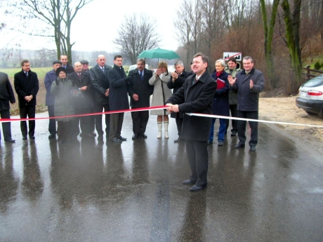 (...) "Udrożnienie systemu komunikacyjnego Powiatu Miechowskiego" współfinansowanego ze środków ZPORR. Nowa nawierzchnię o dług. 10.363 km uzyskał odcinek Bukowska Wola - Janowice, znajdujący się w ciągu drogi Nr 15748: Bukowska Wola-Działoszyce. Po stronie miechowskiej wykonano 4.353 km drogi, zaś w gminie Słaboszów ponad 6 km. Koszt całkowity tych prac wyniósł 2.878.240 zł, w tym udział powiatu 909.170.000 zł. Symboliczną wstęgę na granicy gmin Miechów i Słaboszów przecinali starosta, wójt Słaboszowa, burmistrz Gminy i Miasta Miechów, przewodniczący rad powiatu i gminy Słaboszów oraz radni Sejmiku Województwa Małopolskiego. "Ta droga od 40 lat czekała na swoją chwilę i dzisiaj wszyscy, którzy się do jej nowego wizerunku przyczynili, a także mieszkańcy obu gmin, mają powody do zadowolenia" - powiedział starosta Mieczysław Bertek w czasie okolicznościowego spotkania w Kalinie Wielkiej. Słowa podziękowania pod adresem samorządu powiatowego i służb drogowych dominowały we wszystkich wystąpieniach. Podkreślano efektywność wspólnych działań, które przez lata będą służyły lokalnym społecznościom.Dzisiejsza uroczystość zamknęła pierwszy etap modernizacji dróg w powiecie przy wsparciu unijnym. Zakończone prace przyniosły poprawę standardów jezdnych i bezpieczeństwa ruchu aż 17.319 km dróg na III odcinkach w czterech gminach. Ogólna wartość projektu wyniosła 6.356.000 zł, w tym udział powiatu miechowskiego zamknął się kwotą 2.137.000 zł.