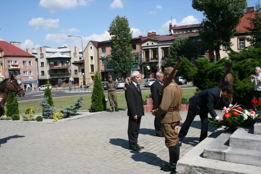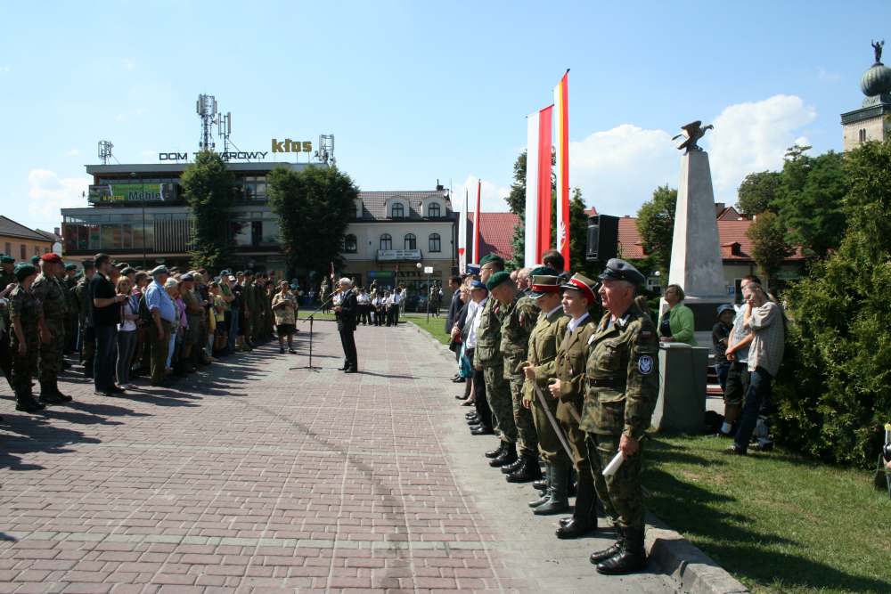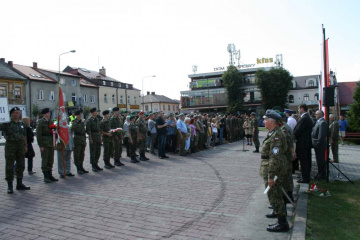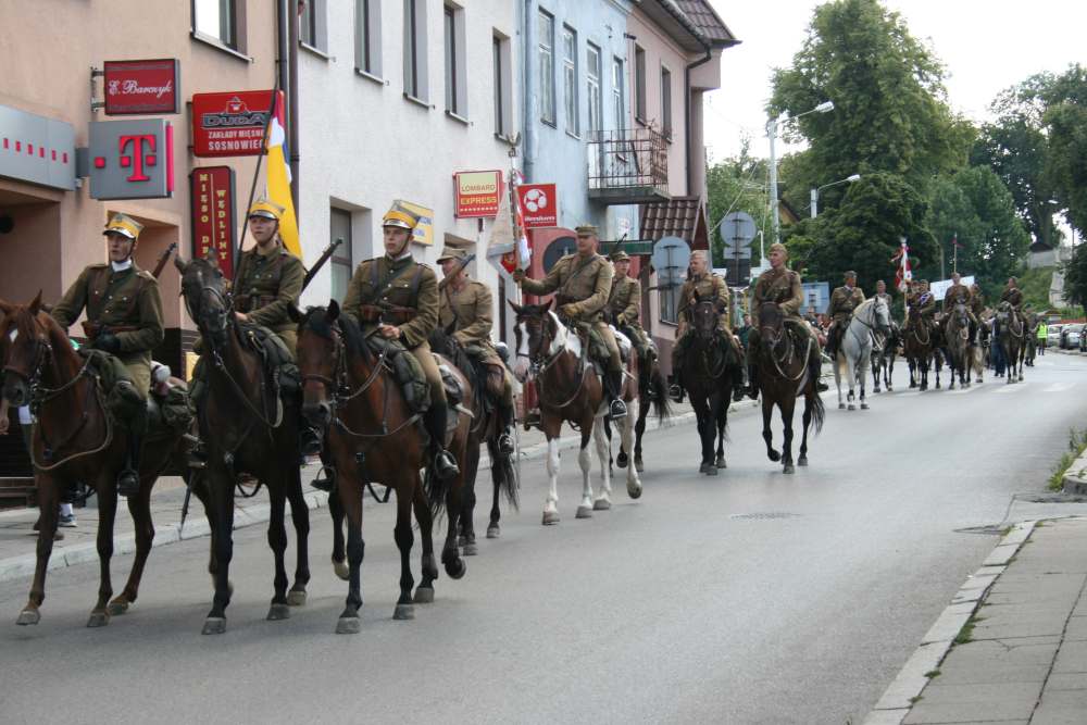 Pieszym uczestnikom, którzy przybyli z krakowskich Oleandrów towarzyszyły dwa oddziały konne reprezentujące: Krakowski Szwadron Ułanów im. J. Piłsudskiego i Świętokrzyski Szwadron Kawalerii Ochotniczej im. H. Dobrzańskiego Hubala w barwach 13 Pułku Ułanów Wileńskich. W centrum miasta zebrali się przedstawiciele samorządów miejskiego i powiatowego oraz mieszkańcy, a z głośników rozbrzmiewały legionowe melodie. Uroczystość pod obeliskiem z Orłem prowadził wieloletni komendant marszu Jan Józef Kasprzyk. Po odegraniu hymnu państwowego przez orkiestrę dętą ,,Sygnał” ze strony władz ,,kadrówkę” witali burmistrz Gminy i Miasta Miechów Dariusz Marczewski i rzecznik prasowy powiatu Ryszard Nasada. – Tutaj w Miechowie od lat czujemy waszą sympatię do kadrówki, zarówno ze strony władz jak i mieszkańców. To nas utwierdza w przekonaniu, że warto organizować kolejne marsze – słowa komendanta Kasprzyka zacytował rzecznik prasowy, czyniąc z nich kanwę okolicznościowego wystąpienia. Komendant potwierdził obopólną sympatię i nawiązał do znaczenia Miechowa na szlaku strzelców Piłsudskiego w 1914r. Treść historycznych dokumentów, w tym odezwę Komendanta Legionów odczytał z-ca komendanta ds. wychowawczych Lucjan Muszyński. Następnie pod obeliskiem złożono kwiaty. Po zakończeniu części oficjalnej uroczystości i odśpiewaniu ,,Pierwszej Brygady” uczestnicy święta przeszli do miejskiego amfiteatru, gdzie zostali podjęci tradycyjną grochówką. Nocleg z 7/8 sierpnia uczestnicy marszu spędzili w zespole pałacowym na Mirowie w Książu Wielkim (dzisiaj zlokalizowany w nim jest Zespół Szkół), w którym niemalże przed wiekiem polscy żołnierze wraz ze swym komendantem spędzili noc. – Po tym pałacowym parku spacerował Piłsudski myśląc o wolnej Polsce. I dał ją nam – przypomniał komendant Jan Józef Kasprzyk.