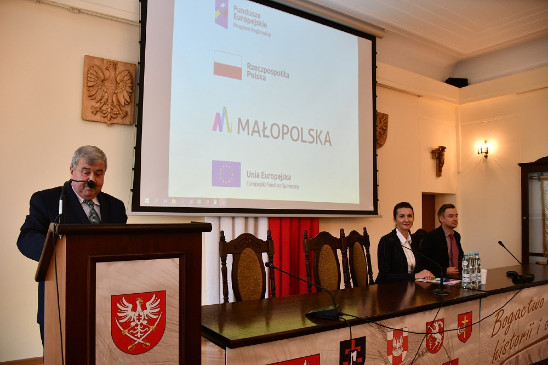 Konferencja nt. "Tele-Anioła" od lewej: Jacek Kobyłka, starosta powiatu miechowskiego, Marta Malec - Lech, członek Zarządu Województwa Małopolskiego, Dawid Konina z Urzędu Marszałkowskiego w Krakowie
