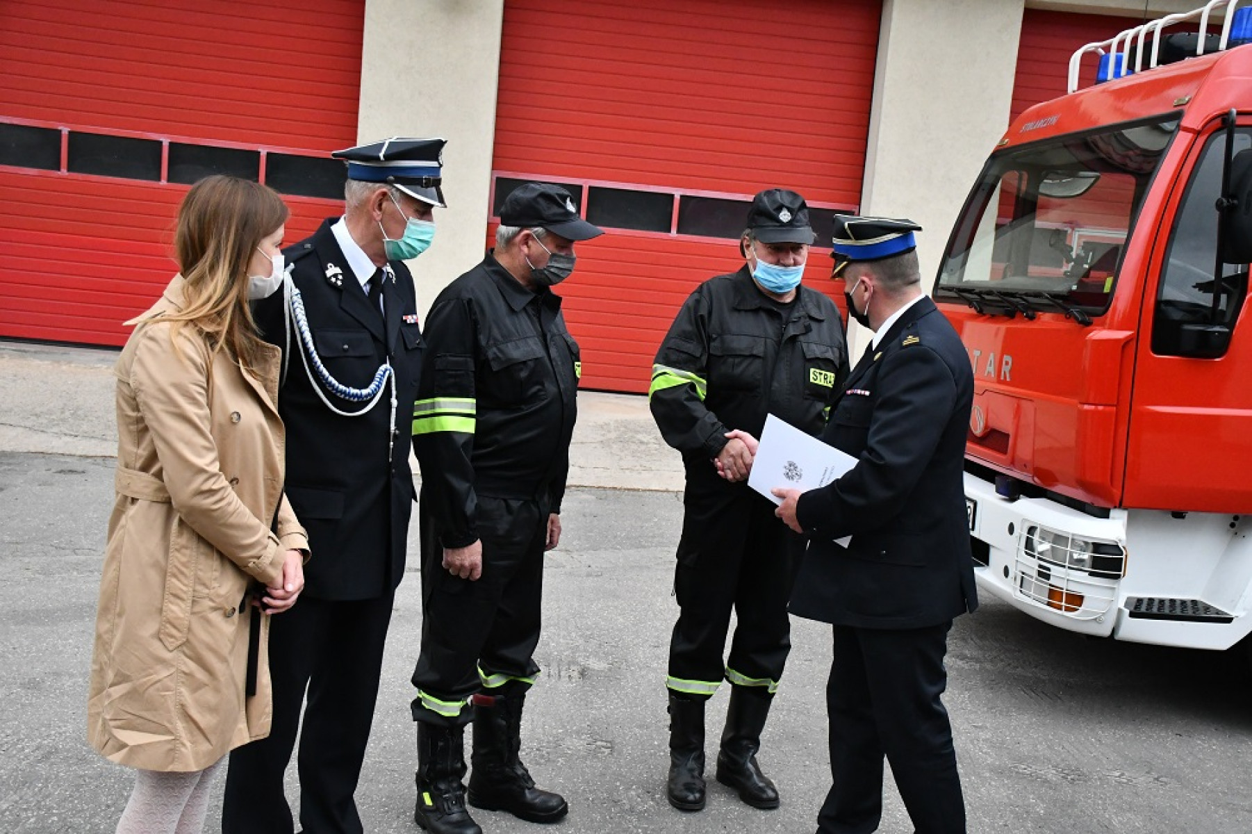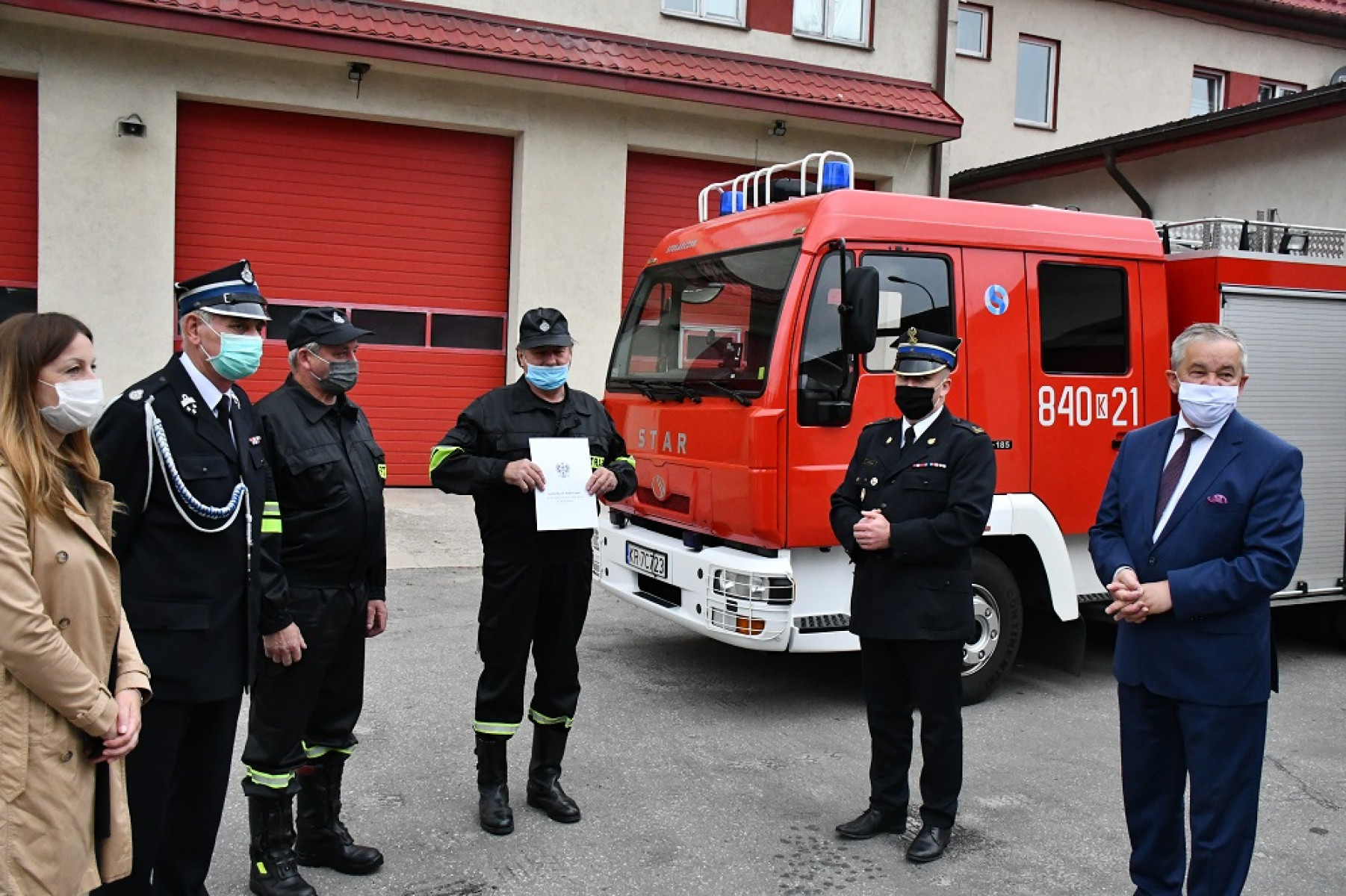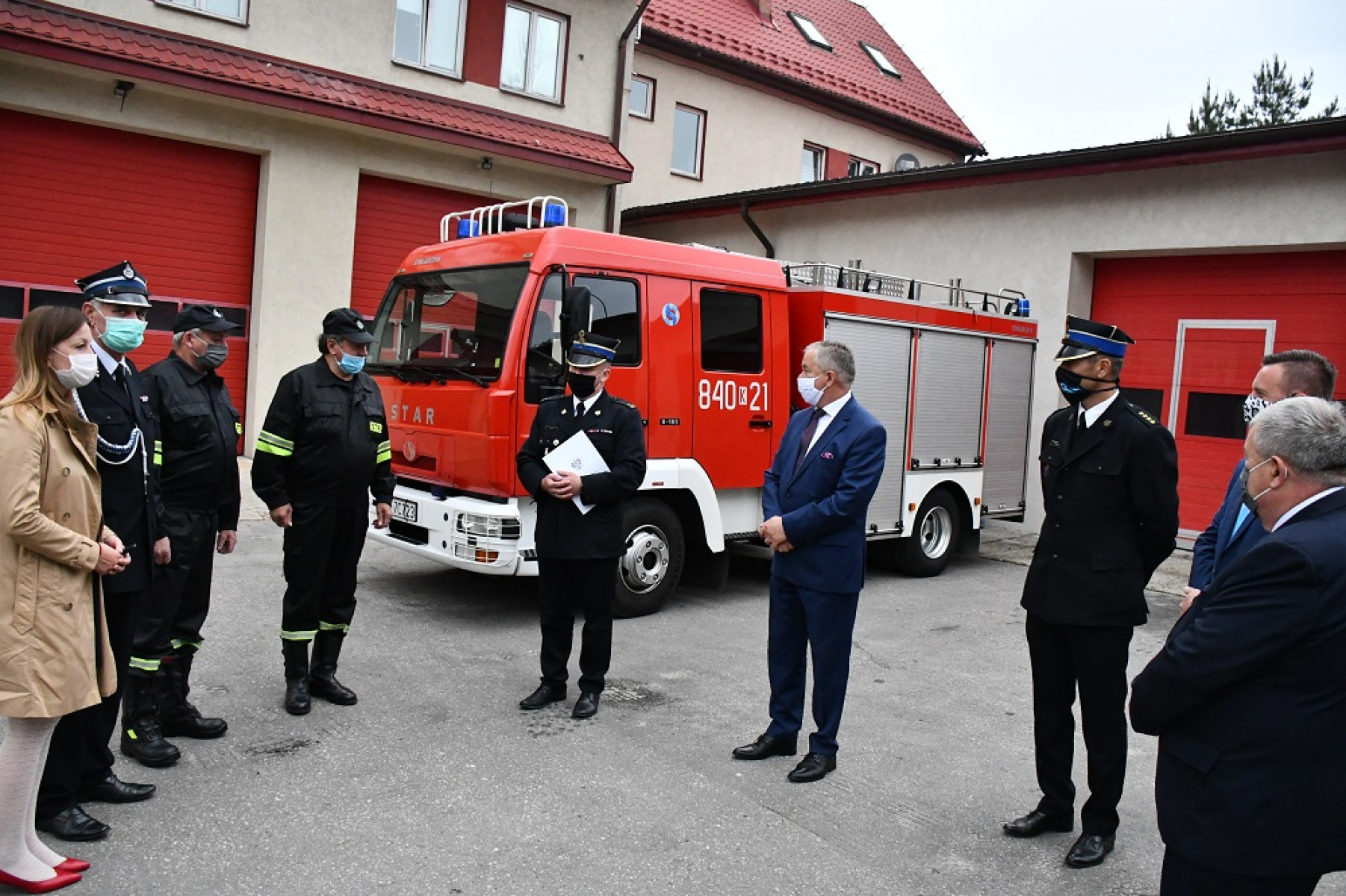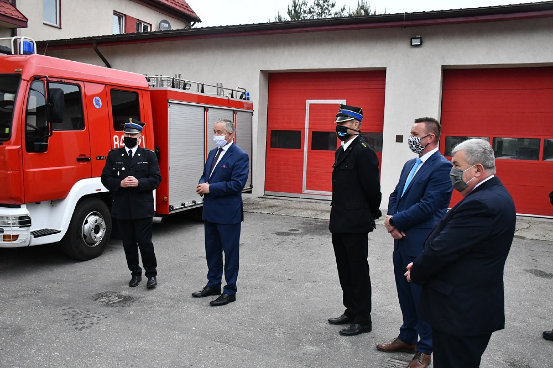 Władze Powiatu Miechowskiego i komendanci KP PSP Miechów biorący udział w przekazaniu pojazdu dla OSP Nieszków